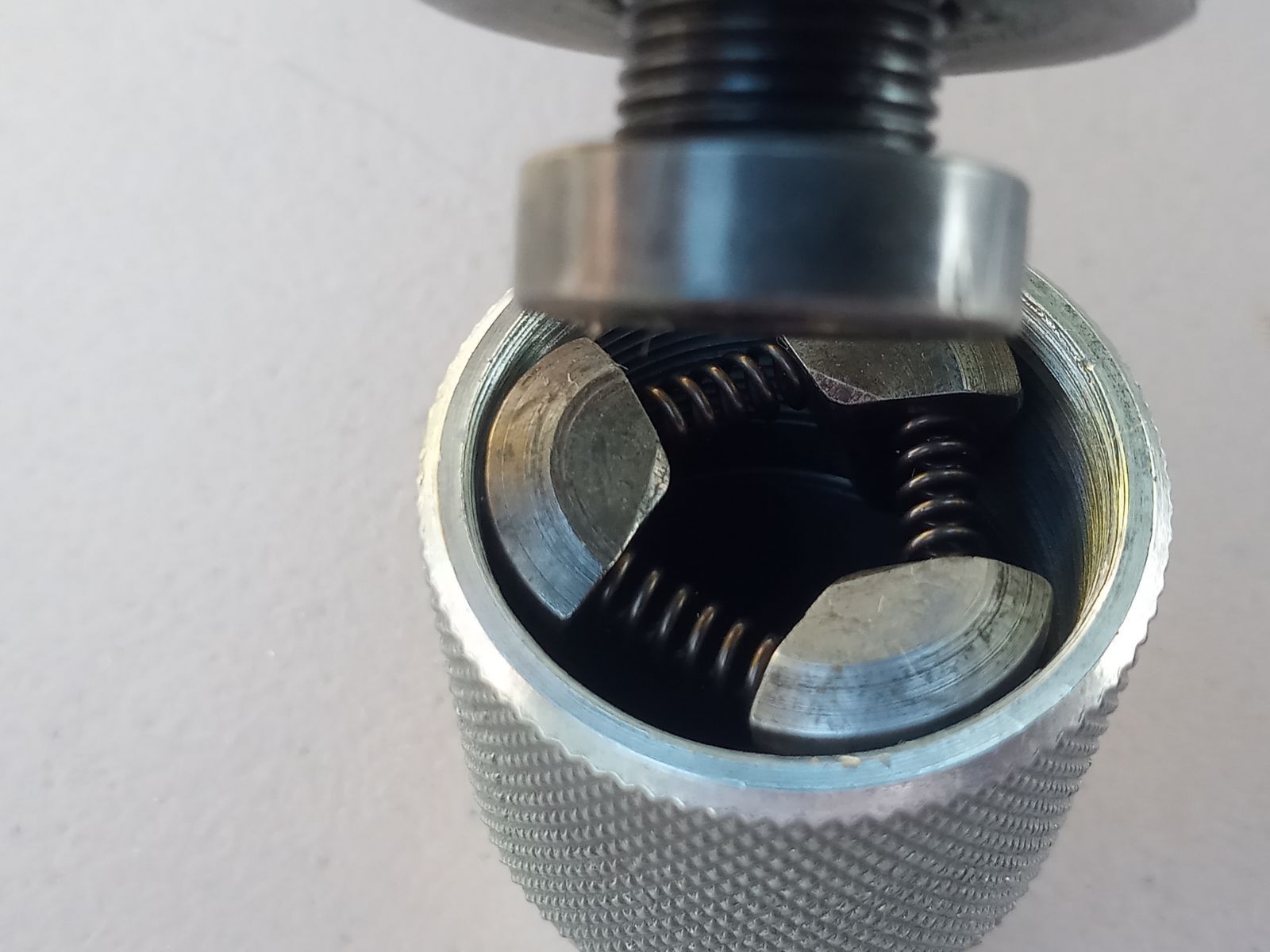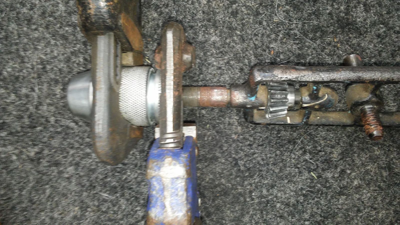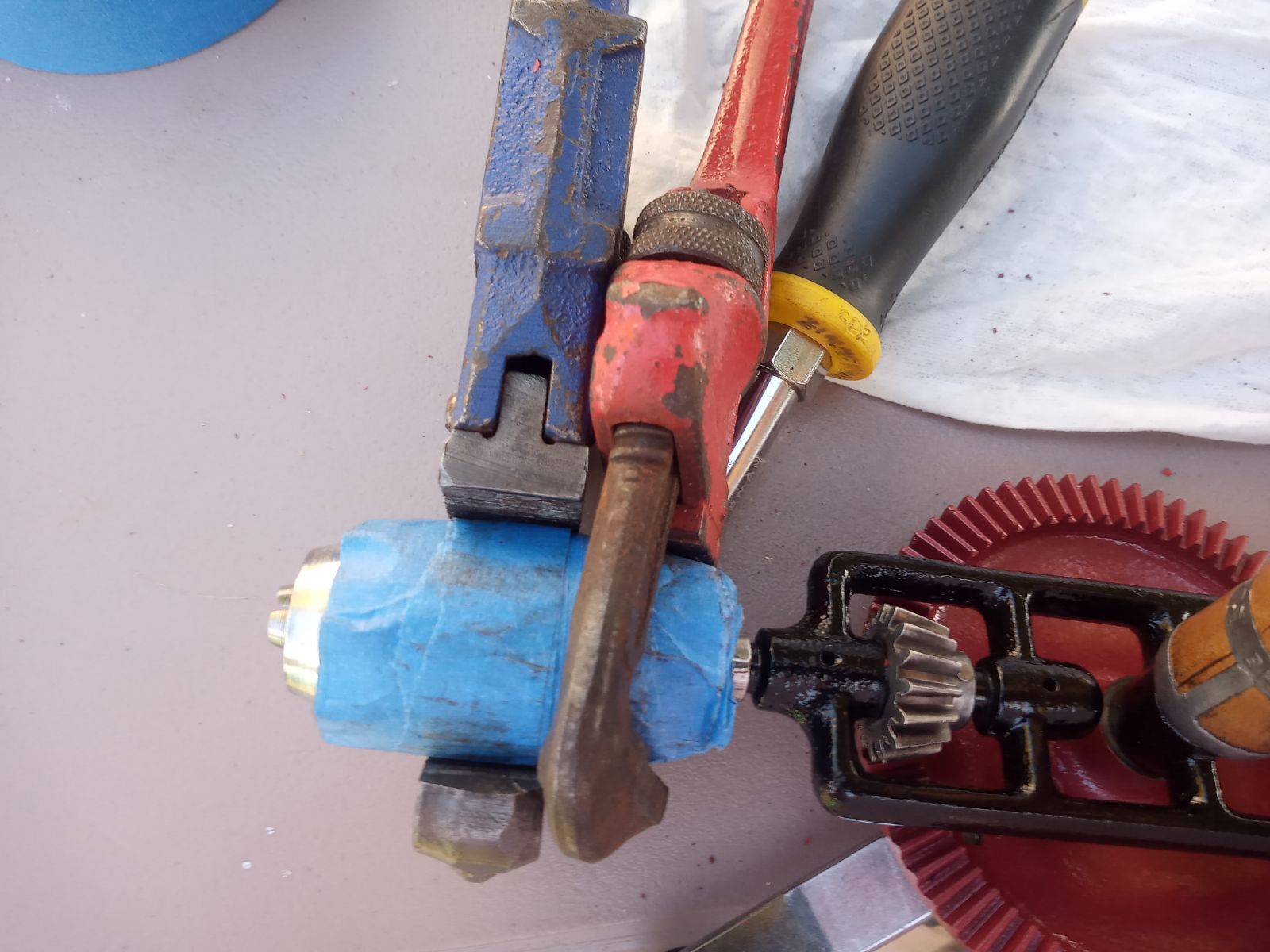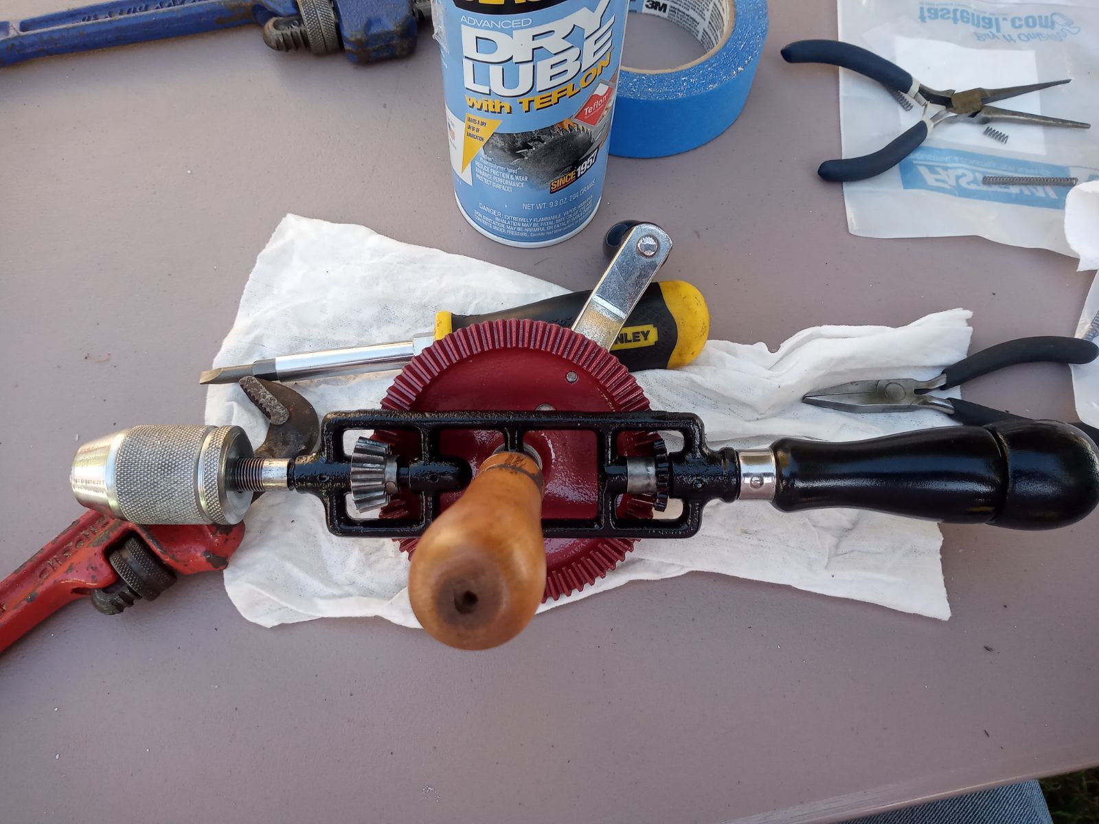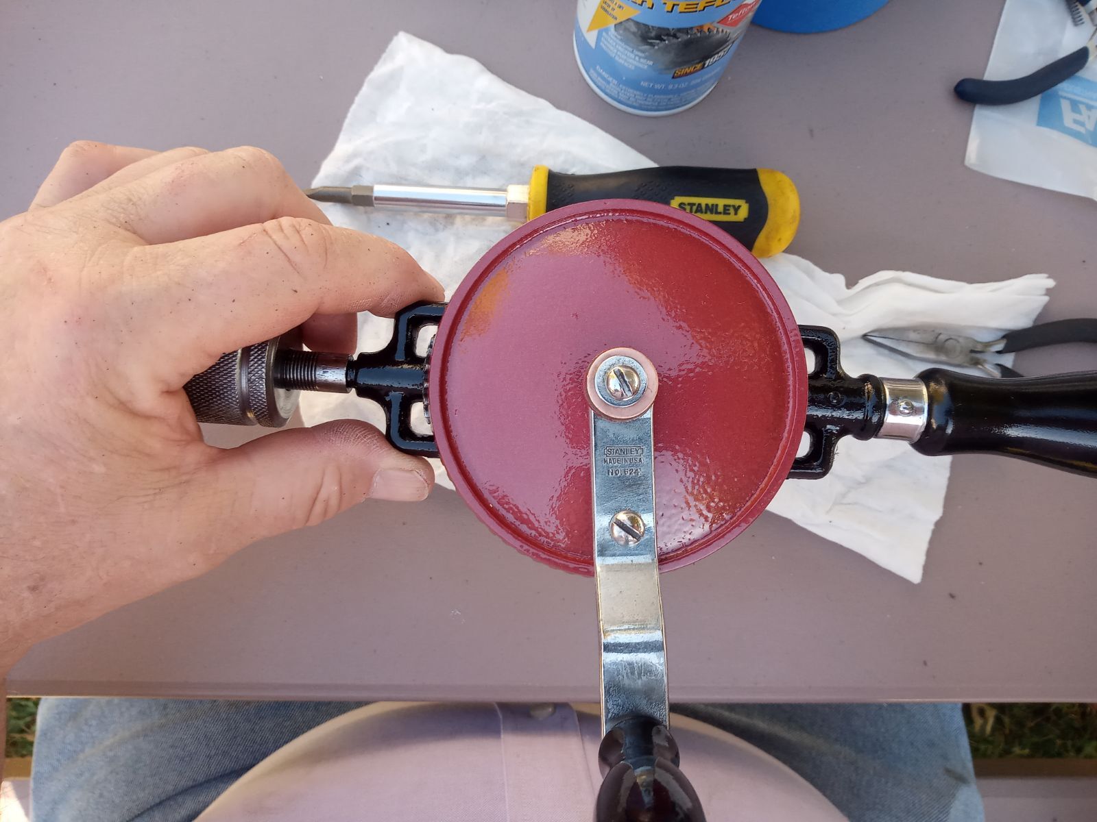 I'd purchased this drill with a "collection" of other items 3 or 4 years ago.; IIRC I paid $2 for it. Once I brought it home, it took a couple small (10") pipe wrenches to loosen the chuck so I could get the broken drill bit removed. From the damage on the end of the chuck, I'm guessing it wasn't the first time either. Probably explains why the chuck jaw springs were damaged too. Anyways, tossed in a box not sure I'd even attempt to rebuild it. Once the kids were back in school last year, I finally got A Round 2It. It had been used & abused. Perhaps was an early cordless paint mixer? None of the original bits were in the handle, BTW. Removing the chuck cap from the body required more force than usual. The damage to the drill shaft where there's rust was inflicted by the previous owner(s) Once disassembled it was a little dry and rusty but cleaned easily with a wire brush on a drill first followed by wire brushes on a Dremel. Damage incurred to the chuck body from attempting to over-tighten a bit too large for the chuck capacity (3/8"). Slight burr on the flywheel was first dressed with a fine file, then smoothed over with a stone taking care to remove minimal material to prevent the flywheel from engaging too deep The drill frame was cleaned up using mainly wire brushes in the Dremel; The handles were scraped using a dull utility knife blade to remove most of the old black, flaking lacquer, sanded with 220g then final sanded with 320g. Masked off, ready for the paint booth. I did touch up the hole with a hand countersink that someone had drilled thru the cap. I think the handle is maple??? Right pic is in the paint booth (also serves as the drying booth) both booths are closed when it rains + during winter months. Flywheel in the paint & drying booth. "Deadman handle in the rattle can lacquer spray & drying booth. IIRC 4 coats of lacquer, scrubbed with a wrinkled up brown paper sack piece after each coat. Some assembly required + manufacture of new chuck jaw springs. Surprisingly Stanley doesn't provide replacement parts anymore. All of the local hardware or big box stores could come close, but OD was too small so I went to my friends at Fastenal. They provided a couple of options...a little pricey compared to the drill original cost ($2) but I wanted the correct OD. Had to cut them to length which was no problem with small side cuts. The one original "good" spring at the top against the new. Jaws & springs assembled ready for insertion in the chuck body. Place the chuck body over the top of the jaws and press down. Easy, peazy; Now place the drill shaft bearing into the body, screw the chuck body back onto the chuck cap. Oh yeah, forgot, spray some of this into the chuck body just before assembly. Now reassemble the rest...Oops almost forgot to de-mask the flywheel thrust surface. I honestly don't remember now if the two metal shims were there originally or not. I scrounged around in my hoard 'er inventory, found some nylon washers and did some experimenting on engagement lash. Common bevel gear lash is typically .007"-.010" but since this NOT a high speed/hi performance drill, I winged it 'til it felt smooth and slightly extended past the mounting post. That & the flywheel is a little warped. Guessing it was never dropped over 100 times. Anyways, I'd have to go disassemble it now to remember what I ended up using. Copper washer was original to the outside for a thrust "bearing" surface. The "deadman" handle is quite unique on the drill. All I've seen on 624's were some variation of a knob similar to the knob on a hand plane. This one is threaded to screw onto the post. The only markings (name) on it are "The Auber." Appeared to be original but IDK. The "cage" material is very soft; I'm positive it's lead but opted not to eat any to be sure. The wood, again, is maple I think??? Fully assembled, The Auber in place. Not half bad compared to what it looked like when it followed me home. Fitting I suppose to use another flea market ($1) find by Stanley to do final assembly...well that and it was the first screwdriver I found plus it's reversible. So it's all together again with one final step to perform. Tighten the chuck cap to the chuck body. To prevent further marring, wrapped with tape. It only needs to be snug vs the standard German Torque of gudentight. My go to paint for this drill or similar, some plane bodies and occasional other tool refurbs requiring black. Dries quickly and gives a great durable medium gloss sheen. The closest I could come to match the flywheel original paint & finish was Hammered Red plus I had it in stock. Thanks for watching.