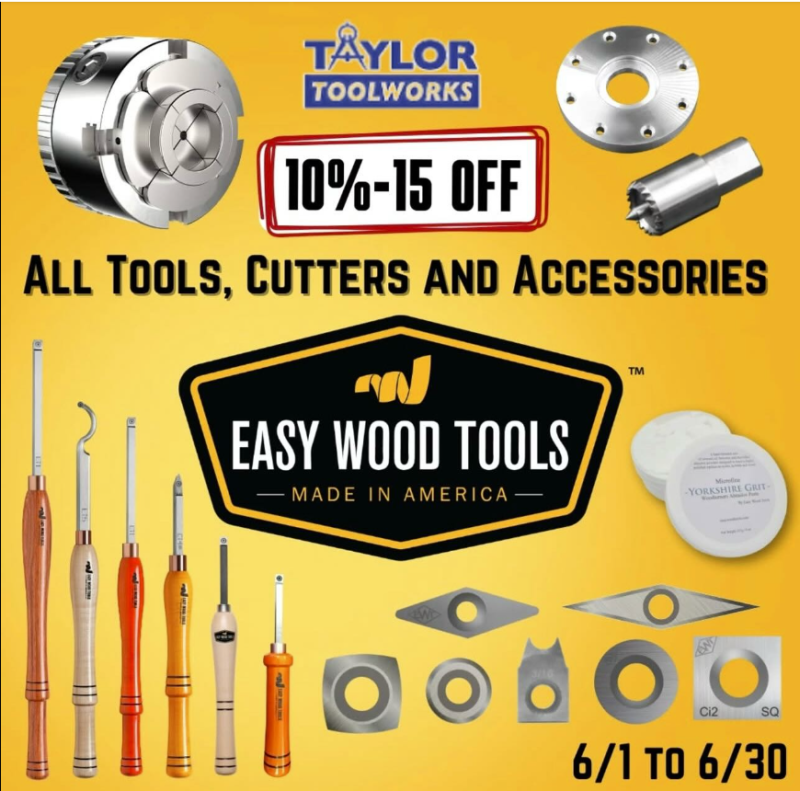 It's been a slow week here for our turners. However, Easy Wood Tools is helping veterans get started and enjoy the satisfaction of woodturning and dealing with their PTSD. You can help this awesome cause by purchasing T-shirts. Head over to the Easy Wood Tools site and order yours while there is still time- https://www.easywoodtools.com/ Our Patriot Turners- Everyone was busy cleaning their shops What’s Coming Up- Click on the images for links to more information and registration. The mid Atlantic Woodturning Symposium- From Craft Supplies USA- For The Newbies- Scroll chucks are are excellent for holding turnings but they can leave jaw impression marks on your work. In this video, Richard Raffan demonstrates how to almost completely eliminate them- A great video from Jim Rodgers on why catches occur when using gouges- Alan Stratton comes up with yet another method for turning scoops. This is a one piece scoop- Speaking of scoops, here's an old video from Tim Yoder demonstrating how he does it- Expand Your Horizons- How thin do you turn your bowls?? Here, Kent Weakley demonstrate techniques for turning really this bowls- Sometimes the turning we had in our mind isn't quite what comes off the lathe. Here, Tim Yoder makes design modifications on the fly. The results are pretty neat! If you have one of Ruth Niles' Joyner Off Center Jigs You know it can be a little frustrating imagining exactly what the final pattern will look like. In this video, from the AAW, Dawn Petrie-George shows how to create a template to help with this. Speaking of Ruth Niles, Cindy Drozda recently did a live stream on YouTube making bottle stoppers using Ruth's products- New Turning Items- Mike Waldt demonstrates a modular tool rest system. Not sure if this manufacturer is available in the U.S. Here in the U.S., there are several sources of similar products including Nova, Sorby and other woodworking outlets. Not a new item but a sale on sanding supplies from Woodturners Wonders- Check out the deals here- https://woodturnerswonders.com/collections/weekly-sale Everything Else- Rick Turns list of YouTube woodturning videos from last week- Safe turning