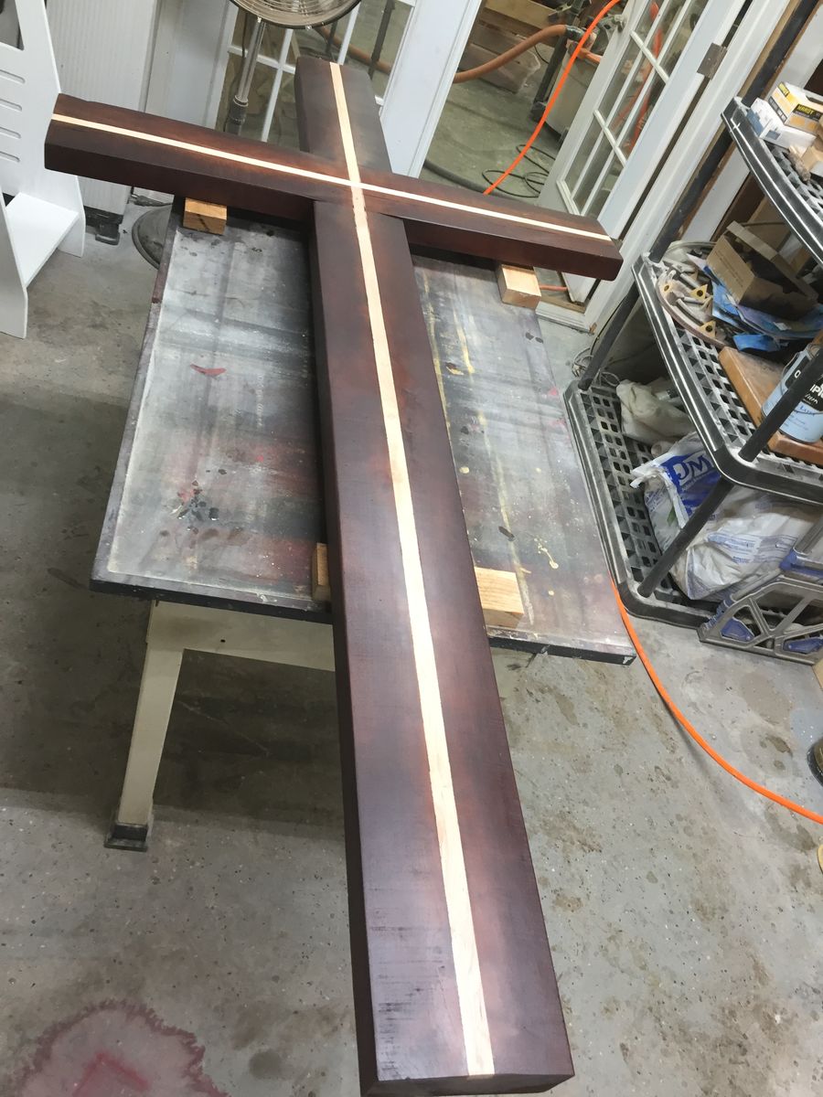 Last Friday I got busy early and my good friend Ron stepped in and posted for me. I worked quite a bit at the range and tried to squeeze in some time in the shop. Josh has been doing most of the work with me coaching. We we have worked on and off this huge cross for some time and they were finally to hang it so we got it finished and delivered. Made of Solid Cherry and dyed a blood red for the Blood of Christ and the white Maple down the center to represent the purity. They got if hung and said it was very heavy. They had access to the back of the wall and put blocking in to attach it from the back. We’re about ready to start assembly of the Red Elm Kitchen work table. I just like turning the feet and I should get them this weekend. And we are close to finishing a White Oak slab top executive desk. drawers on the left and door on the right with shelves inside. Door fronts will have a live edge on them. A center door and we will be ready to assemble. So so what’s on your agenda this weekend? I love to see your projects and pictures. Share your projects here and show us your plans this weekend. Whatever you you do have fun and be safe. -