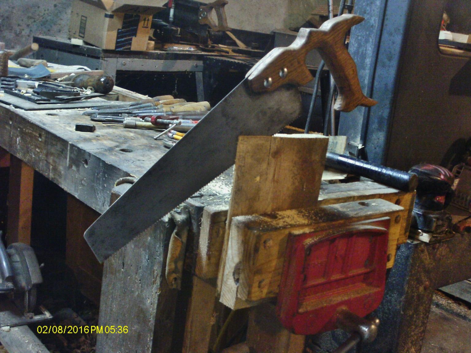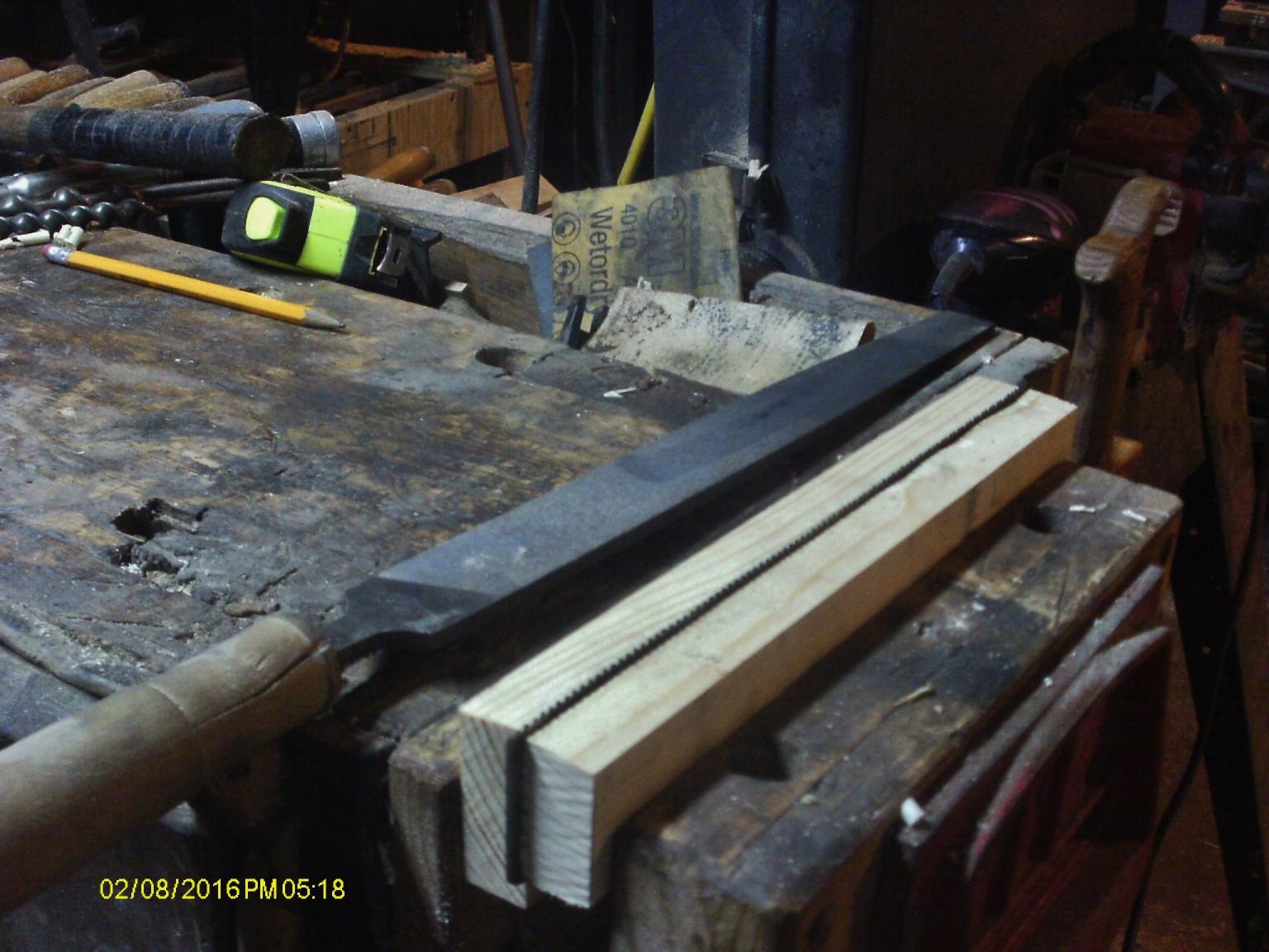That little tool box saw I rebuilt last week? Well, needed to hammer a few kinks out of the plate. Got rid of the "wave effect". Decided to clamp the saw up into a "fancy-schmancy" saw vise, and work on the teeth a bit Wood was a hair on the wavy side. Oh well, the wood merely needs to hold things still. Got out a small file... a jointer file. To make all the teeth the same height. Then fitted a file to a fancy handle.. Has a thumbscrew to hold onto a file. got a few teeth done, needed to add a c clamp, to pinch in the top of the jaws a bit. About three strokes, straight across, per tooth. File the saw as a rip cut. No rack was added. Didn't take all that long to get to the end.. Well all done, how about a few cuts to try this saw out? 1 st cut.. Saw cut #2. made a couple more.. I think it is about ready to go. Took it back upstairs, and placed it in the brand new Pine Tool Box. Might just work?