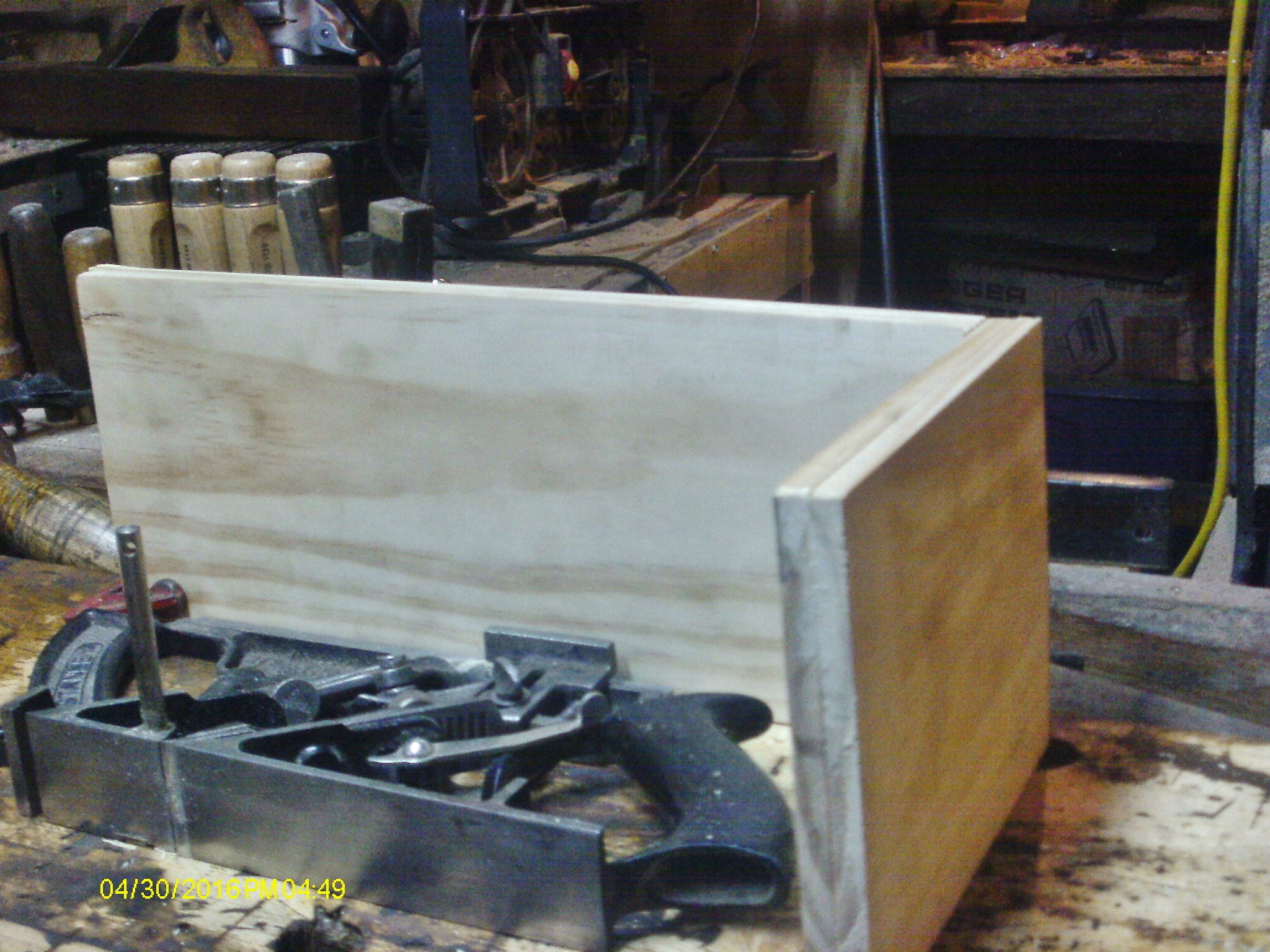 Yet another "Simple Little Box" project. Went out and spent $6.99 on two pine boards. 3/8"x 5-1/2"x 24" and 3/8" x 5-1/2" x 36"......A bit of measuring for the lengths needed, mark a line.. Stick it in the vise, grab a handsaw.. It was sold ( and etched) as a Craftsman saw. Get four pieces cut to length.. Hmmm, might be a tad too tall? Laid out some lines, and some tools.. Lines were spaced using a chisel that will also be chopping out the waste, the toys used? Spaced according to that chisel....kept thinking about the height issues, while taking a Mountain Dew break.. decided to mark how much needed to be ripped off.. Pencil points out how much to be removed, Bandsaw this time, was a bit quicker. Planes to dress the edges straight. Clamped the first one in the vise, backsaw to saw on the lines. then a bit of chisel work Then used these two to layout, saw, and chop fingers on the ends pieces, and a test fit.. Then just kept going, until all four MARKED corners were done. Had to mark which was the top ( T) and which corner matched ( #1 to #1) and got yet another test fit Hmm, well, clamps and glue should help...... took the time to see how the two planes will fit in their new home... Snug as a bug in a rug? Well, it is a start, anyway. Just like the last simple box, have a lot more to do....stay tuned to this Batty Channel
