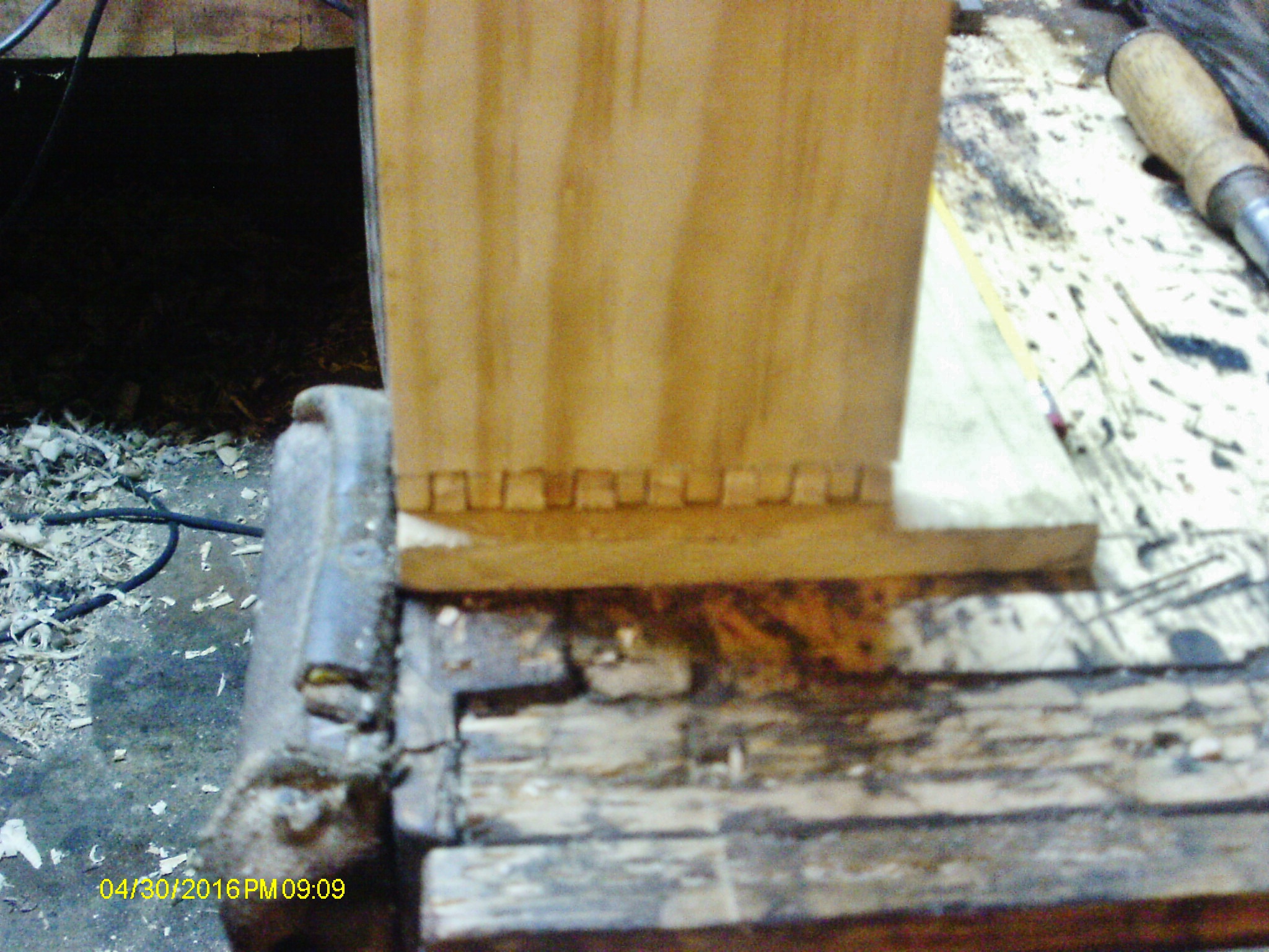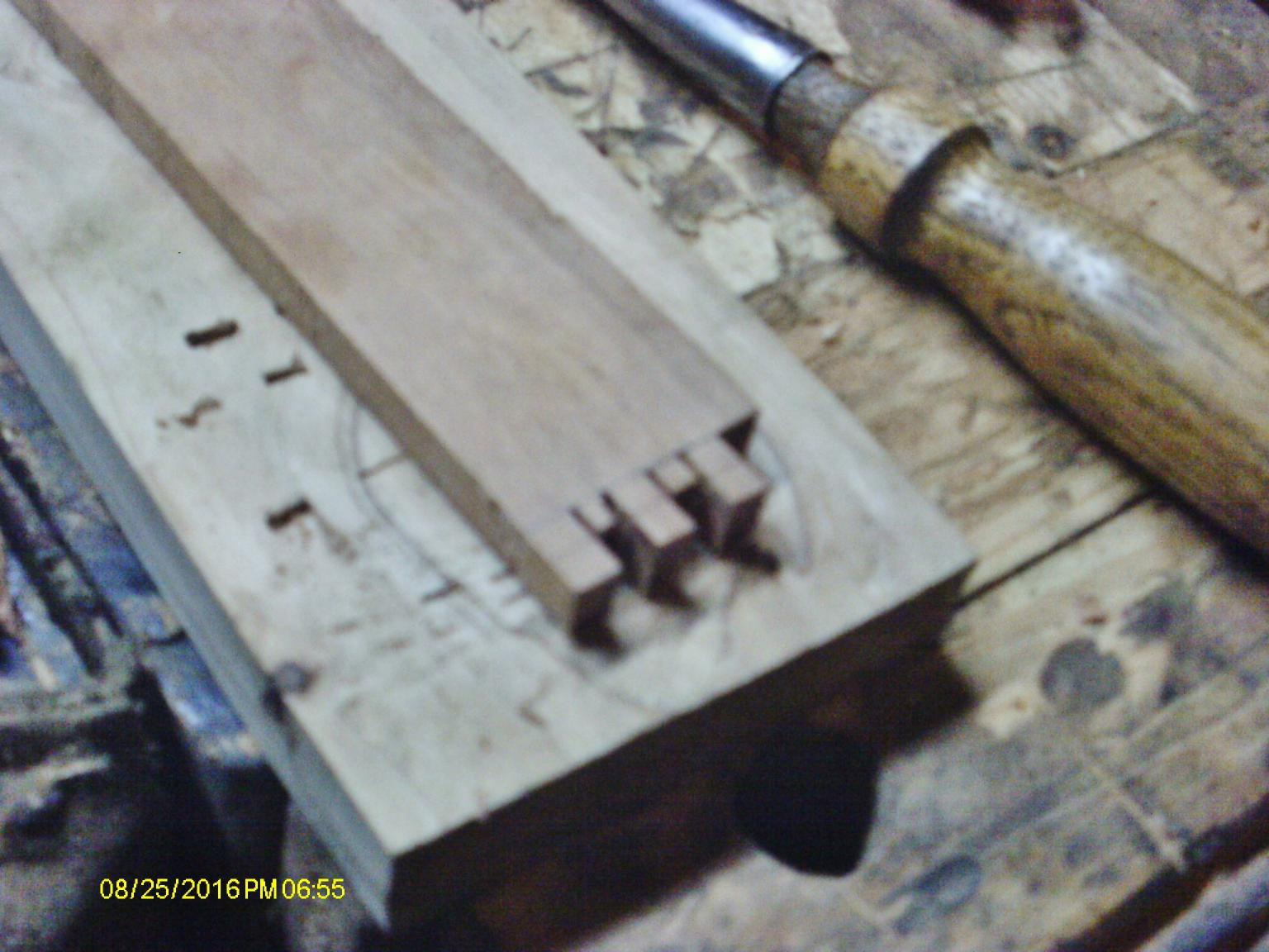 Forward, and at one one backwards. Someday, I might just learn how to do woodworking? Morning started out...meh....got a couple things done on the lid's frame.. Bench has been beat up, lately. Needed something for the chisels to bounce off of. There is a second chisel there...because.. It fit in there a bit better, got one end done...I thought.. Including both ends of the long sides, and one end piece. Then the internet had all kinds of problems that I just had to fix.....needed to go out and BUY ( yikes!) new phone line and new CAT5 line. Old ones were breaking down. The CAT5 wound up too short, that is why I had to get a new one. Whew, had to run around with the Boss, for a bit, too..... Finally managed to return to the chopping block....only to find out the lid parts were too long....hate when that happens.. This was after I had trimmed the end piece to length. Couple of marks to show what I needed to remove.. Something like this? Then a few whacks on a chisel to cut away the "extra" stuff. Bummer that the fingers were already done? Not really, make things a wee bit easier. Finally got all four parts joineried.. I think that will do...for now. Still have to figure out how this slab of Cherry will fit in there... Needs cut to fit...but which type of joint to use for it? Might TRY a T&G? Or...just a groove and a rebate? Have to sleep on that awhile. As for dog holes in a bench top....did you know they are good for... Holding a chisel so it won't roll off onto the floor, or worse, stab my foot? The Witherby 3/16" is in one. The New Haven Edge Tool Co. 1/4" one rarely rolls anyway. That old mallet? Turned that a few years ago, out of Spalted Maple. Been pounding on things ever since......Maybe tomorrow..I might get organized a bit better? Nah, then I'd be dangerous...stay tuned for the rest of the story.