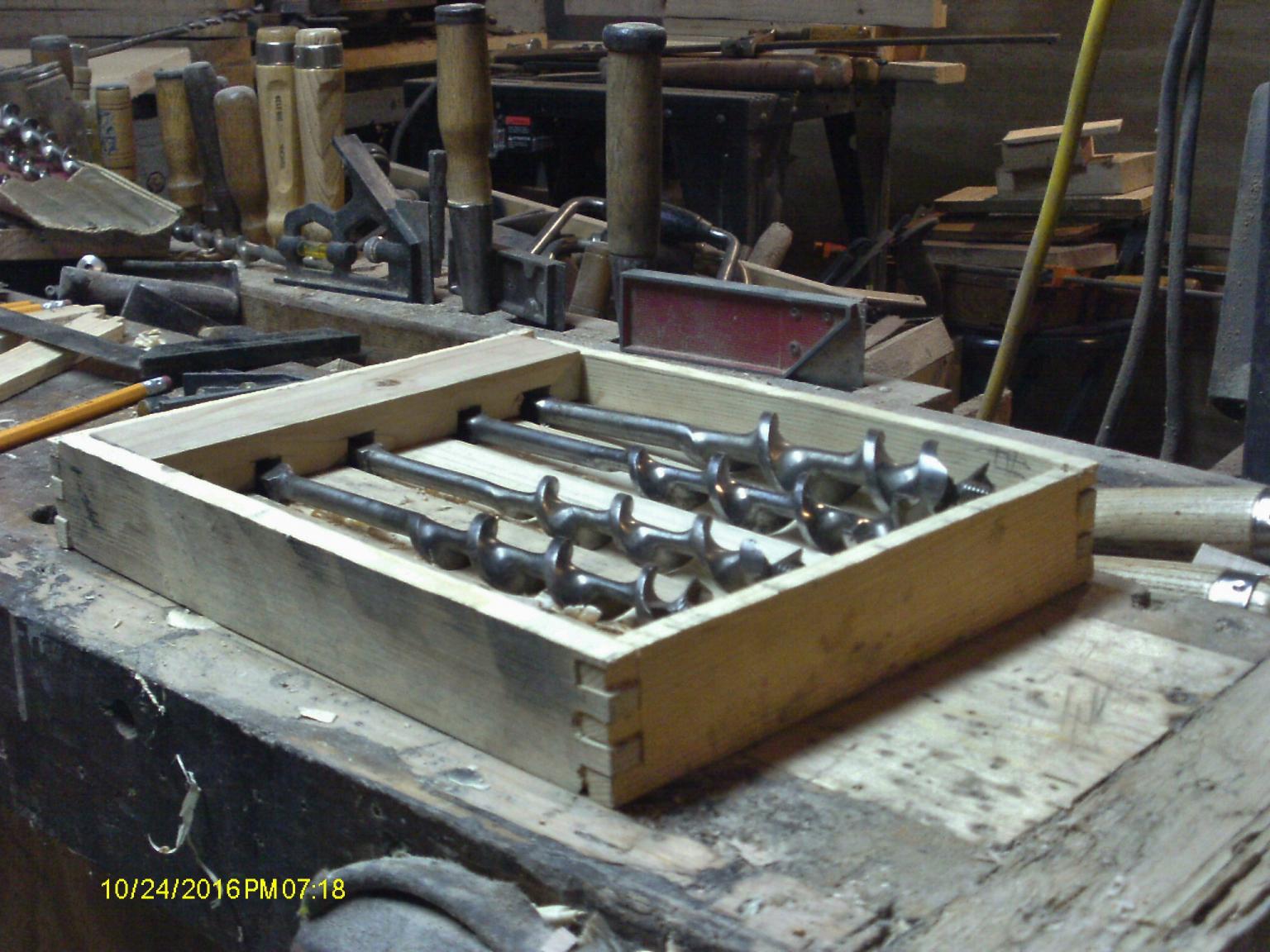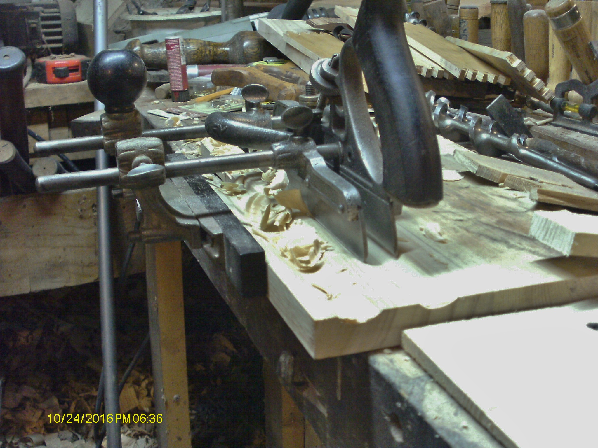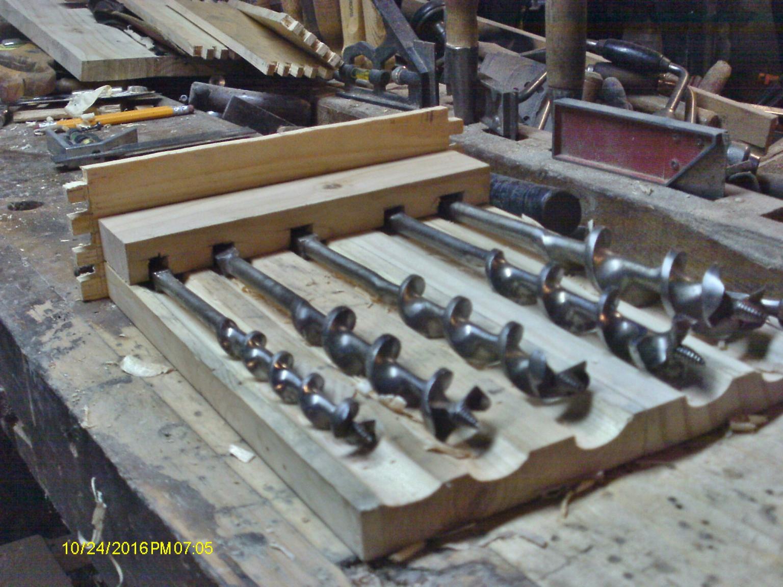 Well...Mister Gumption finally caught up to me, there goes playing hooky for tonight. Had a few more grooves to mill.. Fought the grain on both of these....as for the third groove.. It was getting to be a bit of a stretch, so I dug out the cam rest, and gave it a test drive, too. The last two? I had to turn the blank 180 degrees, and come in from the other side.. The grain was a lot better to work with. Made that groove with just a single setting. Groove #5 soon followed. Time to make a holder for the shanks to sit in.. Marked out where each bit was, bandsaw to make a bunch of cuts. Chisel to knock out the waste, and pare things smooth. Test fit on the holder end.. Something like this. I could also mark where to cut the outside pieces at, and then give them a test fit... So I could see what needed trimmed where. Glue & nails, might as well get the glue up started.. Glue and nails, and a few clamps. Kept working my way around, had to trim a few places. Then a forest of clamps... Begining to think I should have done the first two this way......might have been a little easier? Tried out the bits.. Seems to look a little better? Still have enough pieces to make the fourth page... But....I think it can wait a day. Will need to change the cutter in the Stanley 45, first. The blank needs to be flattened out. Scrub plane then a smooth plane for that. Both faces. Yep, it can wait a day or so. Stay tune to this Batty Channel.....same Bat Time.