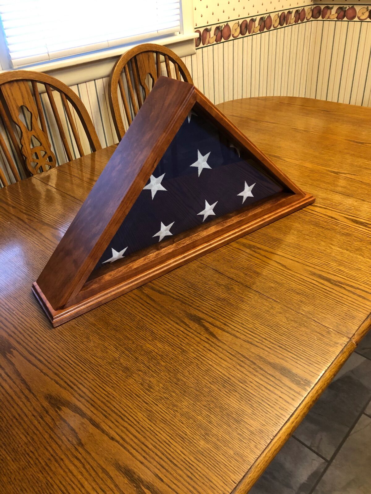 This was harder than it looked!!! Had to go back to woodworking basics - cutting angles, especially the 22.5 (youtube vid made it look so easy) needed for the base. Plus the slot for the acrylic and notch for the back. Then put it all together and hoped the flag would fit. I've seen better folds but this is what was used. Made a lot of firepit fuel and probably have enough pieces cut and laying around to make another one or two boxes. Makes one appreciate "old school skills." Tip: unlock the head on a compound miter saw before trying to use it. Works a lot better. This is for my wife's step dad who adopted her kid brother when he was 10 and raised him. Going to give it to him this afternoon.