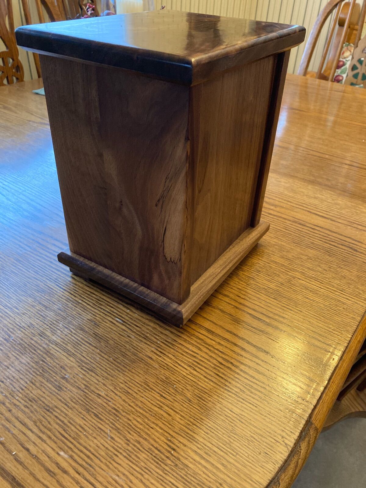 A couple of weeks ago Keith Mealy (I think) posted a link to a cremains cask for veterans. I decided to build one so I selected a piece of slightly spalted black walnut for the lower section and a piece of burled walnut for the top. Unfortunately, The burled piece wasn’t quite wide enough so I had to glue them but the results were beautiful. The sides were sanded to 400 grit and the top was sanded to 1000. Oddly, it took 5 coats of GF Arm-R-Seal to get the look I wanted. On a slightly different note, I was honored this week by a sale on my Etsy store of a burial flag case. It will hold the flag of a vet that died in 1945 in WWII. I’m humbled by the privilege to build it.