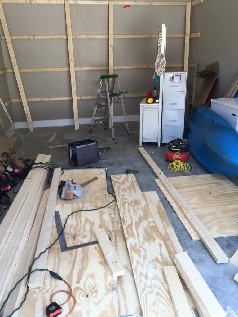 Working on garage shelves for my son and I think I made better progress today by myself than with his help last night. the brackets on the back wall he helped with. Today I cut long supports and shot ones and put up the side wall brackets so far.