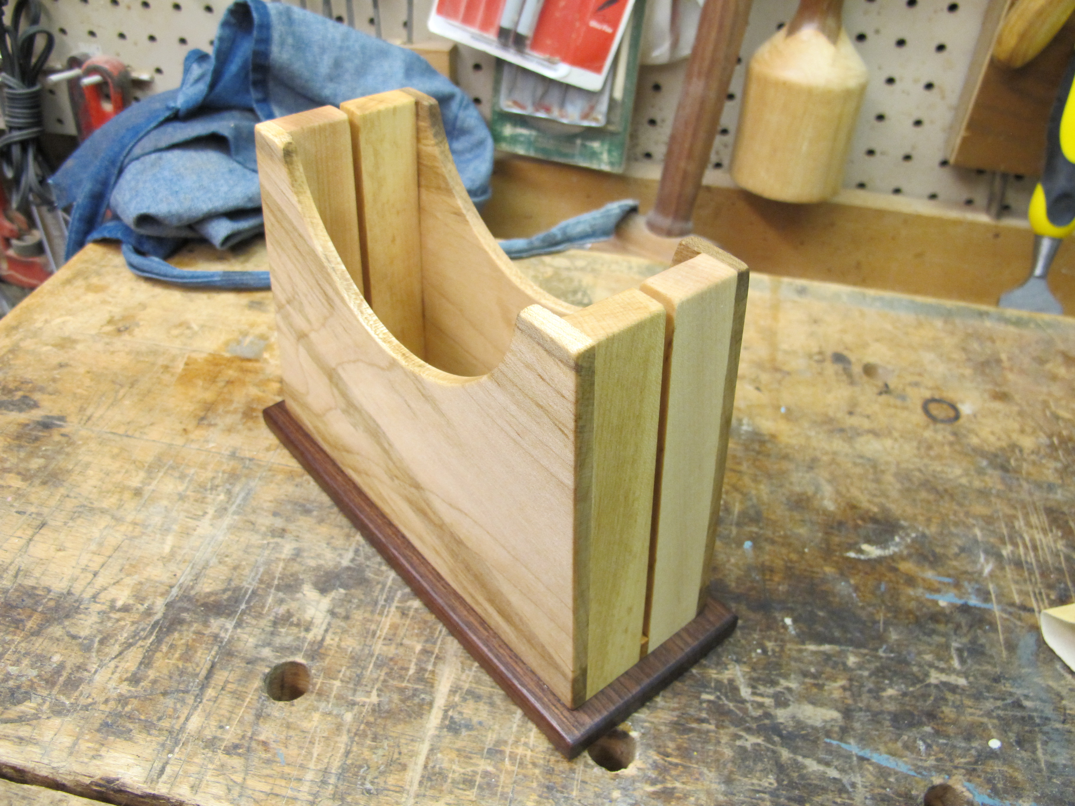 My sister "commissioned" this for her husband. She said price was no object (as in free) because it probably be cheaper than a trip to the emergency room. I found a couple of designs from a Google search and he picked the one he liked. It's large enough to hold the "deli" versions. Made from scraps from the lumber rack. Maple, Walnut and a small piece of cherry. All glued joints. Finished with mineral oil and bee's wax. Time to get back to the lathe!
