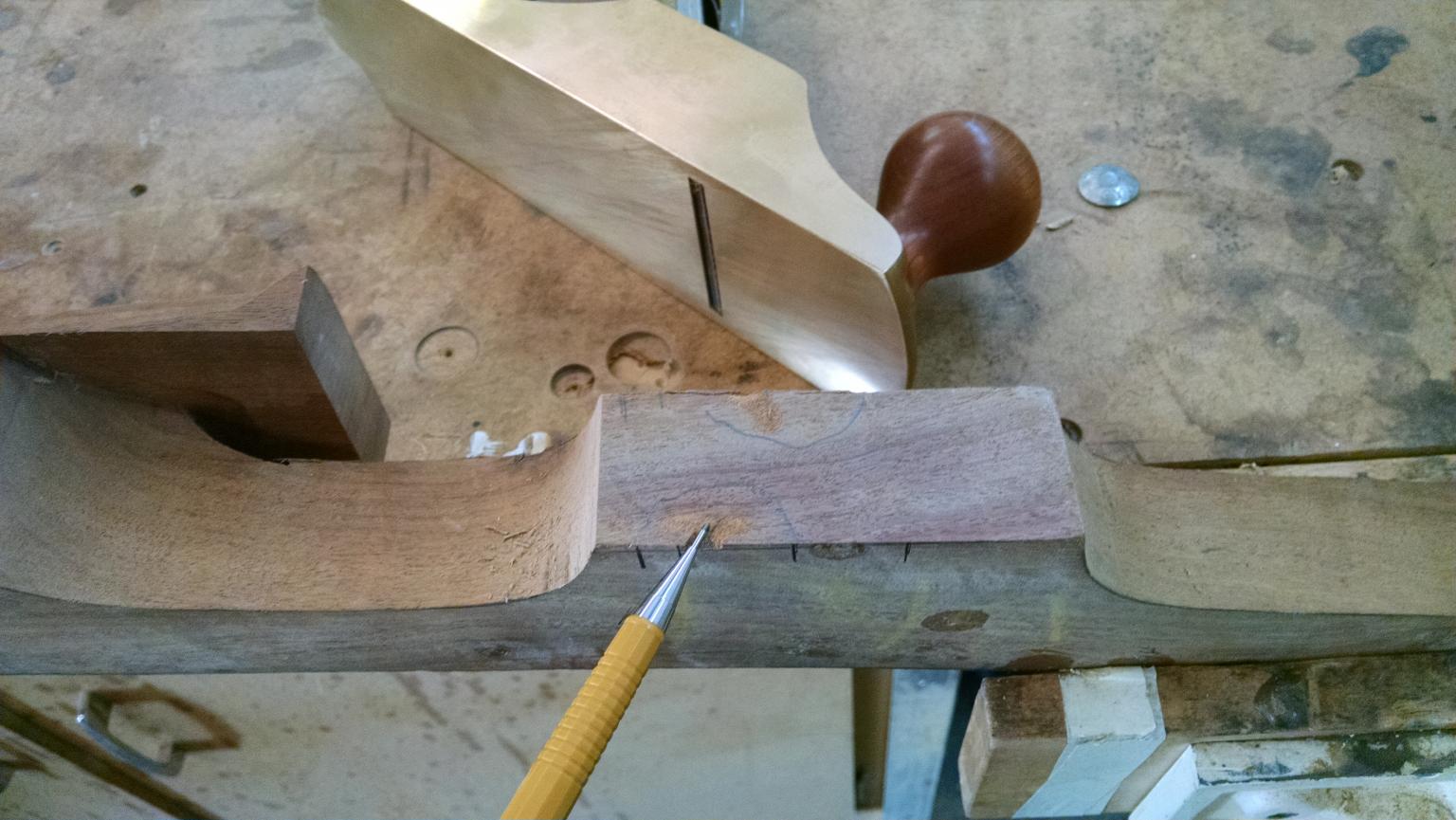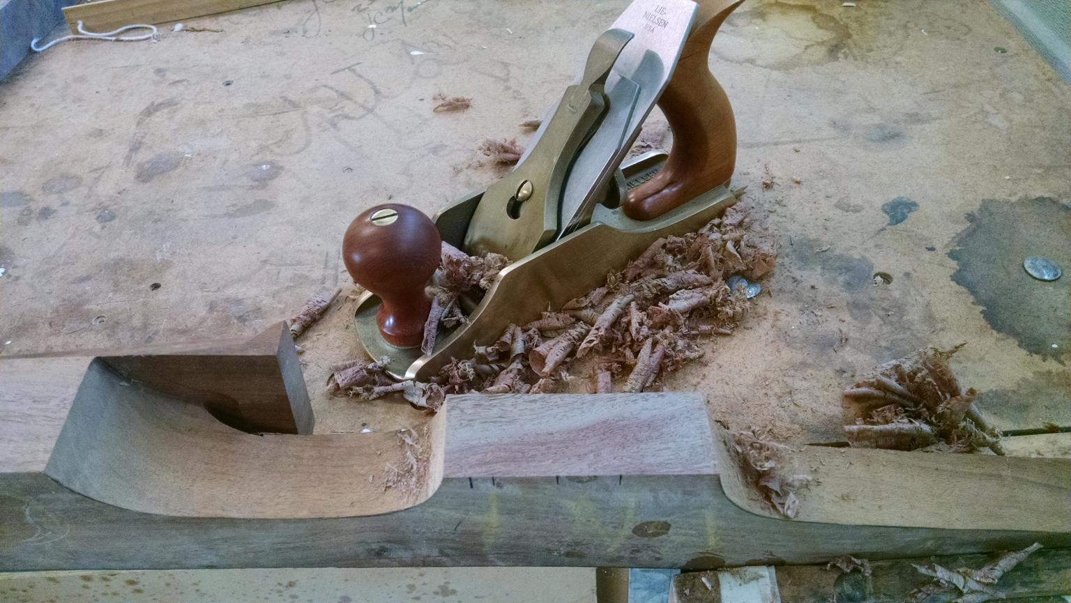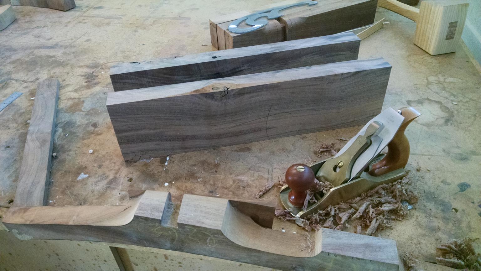 Working on the rear legs of this rocker. I am planing the faces true and flat for the seamless leg to arm joints. This face must be dead on flat and smooth in order for the arm to mate up properly. The imperfections must be planned away. Got it. Arm blanks in the back. It doesn't look like much yet. But it will be!