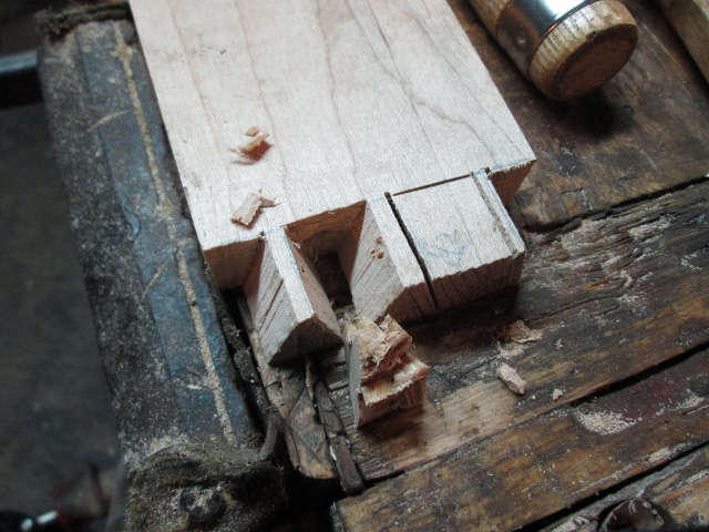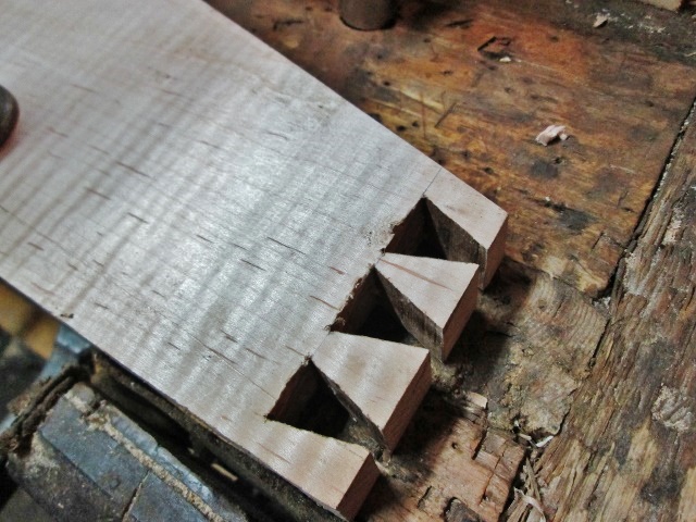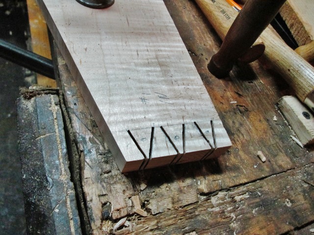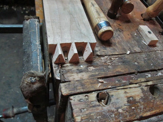 Rather than bury this in the Desk thread....corner work for the desk means dovetails.. I jointed the edges. Nice to have a square end to work from.. Laid out the pins first ( Easy to mark out the tails later) then a bit of saw work... This is now my "Go-to" saw for joinery...my other good saw stayed down at Charles Neil's place... Have to remember which is removed, and which isn't. Cut the edge ones off, which left this.. This is how I chop out the waste...I leave a tab out on the end, because... It supports the waste until it pops out. Got all this done.. NOW I can use this to lay out the tails.. Not sure about anyone else, but I am terrible at angled cuts....cheated and used the bandsaw. I stayed on the waste side of the lines, trying to leave the lines.. Then back to chopping.. Same as before. Then flip over and chop some more, until the waste pops out.. Maybe a little clean up? Dry fit to see ... Close enough for the girls I run with? One corner done, three to go... And that is how I do dovetails....