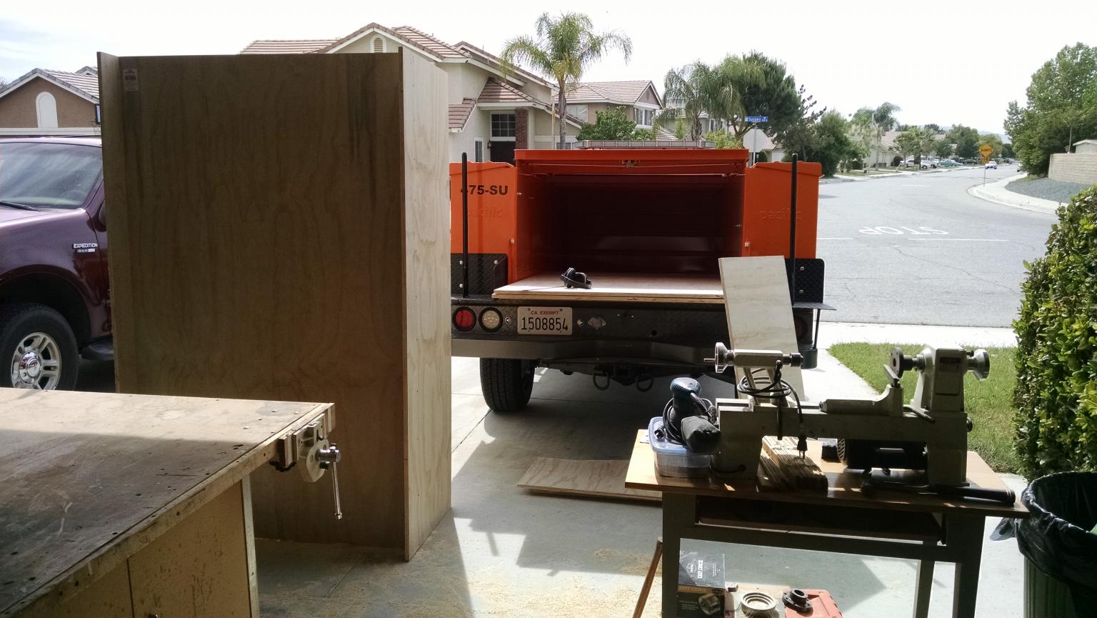 My day job as a Land Surveyor takes my crew and I to many interesting locations around our county. From hiking treks up mountains while laden down with survey gear to re-establish a lost section corner or township line, to building roads and bridges, we do it all. But, I get to do something that the other surveyors don't! I get to work the wood when called upon! Every few years we get some new crew trucks in and I am the guy who gets the job of building the storage boxes that go into the trucks. The boxes house our gear, from leveling rods, to metal pipe locators, to tripods, to lath and hubs and various other ground implements such as shovels, impact bars, machete's and much more. This past month our department became the proud owners of several very nice GMC 3500 crew cabs. These are the nicest trucks we have ever had, this is the first time we have power mirrors, power windows, power door locks, and cruise control, and there is a view panel in the middle of the dash console that displays backup camera, and we can even link up our smart phones to receive hands-free calls, and if you really wanted to you could activate your music playlist on your smartphone, but we'll stay away from that as music is a personal thing and not every crew member likes the musical taste of the other guy. But as crew chief I do choose the radio station, and typically I'll listen to talk radio. It is what it is, perhaps the younger guys will learn something. So this time, being no different than the next, the powers that be sent me home with a crew truck and supplies to build the first box. I have two more trucks to do. Each box takes a day, from 6am to 4:30pm. Our standard work day, and it just so happens that is how long it takes to fabricate one of these boxes. One of three new GMC 3500 4 x 4 Next few images are just some quick shots I took of the box in build state and finish. Every piece of the box is interlocked with 3/4" dado's using a PC 690 with a 3/4" straight bit. For all the boxes I have built in the past, I always used my PC 7518 for this process, but for some reason I just grabbed the smaller guy, I guess I didn't feel like moving around the 7518 all day, although the 7518 goes through this like butter, the 690 does strain and holler a tad. The box is set in place. I know I skipped a few process's before I got to this, but time being an issue, I had to work fast, and I could not really get as many images as I wanted too. The edge facing is 3/4" oak to protect the ply edges from bangs and bumps. The top section has some 4" PVC tubes, the right tube along with the wood half circle cutouts will hold our various leveling and transit rods. The two PVC tubes on the left house our diamond shaped "Survey Crew Ahead" traffic signs when rolled up, and the space in between those tubes house the standards the signs set on. The lower wide cubbie houses a drawer that holds our 2' lath, 4' lath, and various sized wooden hubs for construction staking, and also our monument pipes for setting legal corners and "Right of Way" and road "Centerline" positions. The metal shop at our yard fabricated those traffic cone racks you see mounted on the outside rear, the black spindles, we stack 10ea. 24" tall cones on each side for traffic control situations. Now you can see the drawer that I built as well, you'll see the right front side is shorter, for the 2' lathe, and the front left, is longer, for the 4' lath. And behind those compartments will house the hubs and pipe. The drawer is on wheels, it slides wonderfully in and out. What you don't see in this picture is the gate latch I installed as the last thing I did. The gate latch is mounted to the outside left of the drawer face, and it latches to the left into the truck box body, this prevents the box from sliding forward and back during travel. The truck bed is a standard 8' long by 4' wide, the box is 6.5' long, we need space to the rear to set a jack hammer into that we use on occasion to dig up monuments in asphalt. We get new trucks rarely, the last time we got a new truck was in 2010. We really use our trucks, I believe the formula used is replacement after 150,000 miles, after that they become more expensive to maintain then to just purchase a new one. And believe me after 150,000 miles, they are beat. We use them in 4x4 very frequently and they get bounced, whacked, and marred up pretty good, as we travel down tight areas and even between tree lined streams, they get beat up pretty good. This beautiful truck will look old in two years. My Crew Truck is a 2010 Ford outfitted the same as this one, my truck still has some miles to go before it's replaced, but it sure is good to see some new trucks for our crew chiefs, there is nothing like a brand new crew truck to lift the spirits of the men. Thanks for looking!