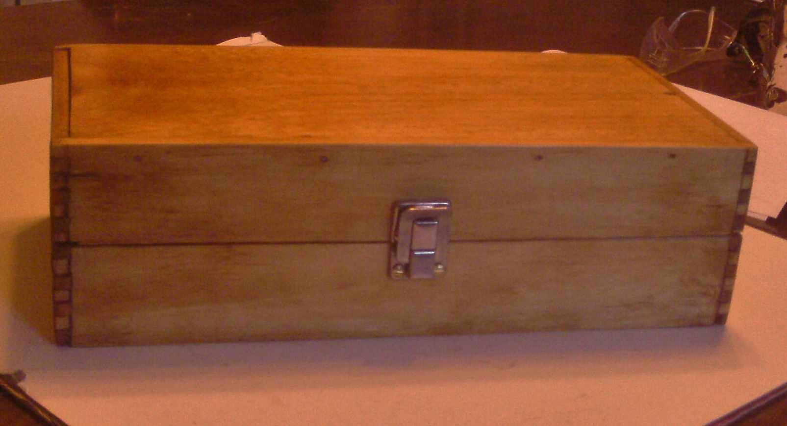 Front view, showing the fancy grain. Handcut finger joints. A copy (as best as I can) of the box Stanley made for their No.45 combo plane. Old box is now a shelf sitter, due to all the breakage done by the uSPS.. -
