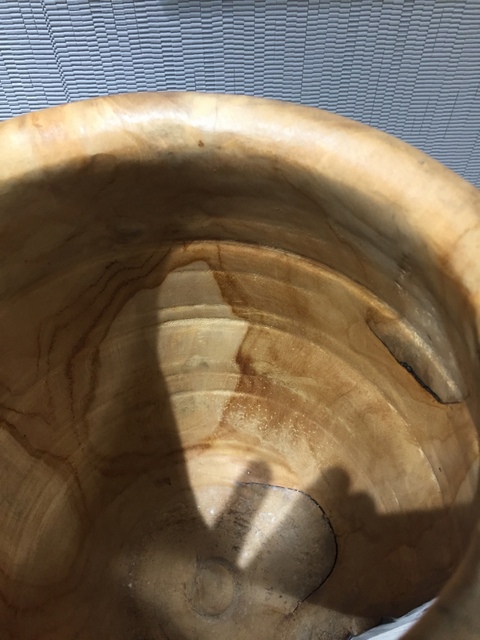 My wife and I were out of town recently and had a couple motel stays. At one of the motels I saw this vase. I want to stress, this is NOT my work. Anyway I saw this wooden vase. My first thought was to see if it were turned by a local artist. Naturally I picked it up, it must've weighed 30 pounds or more. As turners, we are conditioned to turn thin and get things as light as possible so the weight kind of threw me. This vase is at least 3/4" thick, maybe more. When I turned it over I saw that was imported from Indonesia. Still it's pretty wood. I then saw the inside. Once again, we are conditioned and taught that everything has to be sanded and finished to nth degree. This piece, at least on the inside can only be described as crude and rough. Lots of tool marks, lots of tear out. Not something I would ever let leave the shop, just wouldn't. Looking at closer, I noticed the bottom, it has to be at least 3" thick on the bottom, crude, crude, crude and rough. Not up to my standards at all. When I got the chance I showed to my wife. She says; "it's beautiful". Honestly, I have to agree with her about that, from a distance it's very pretty. I pointed out how heavy it was, she says; " it feels really substantial and won't get tipped easily" I like it. I pointed how thick it was, she says; "it's beautiful" "I really like it" I started to point out how thick it was on the bottom, but she interrupted me and said; "someone bought it, didn't they?" What can you say to that? Steve