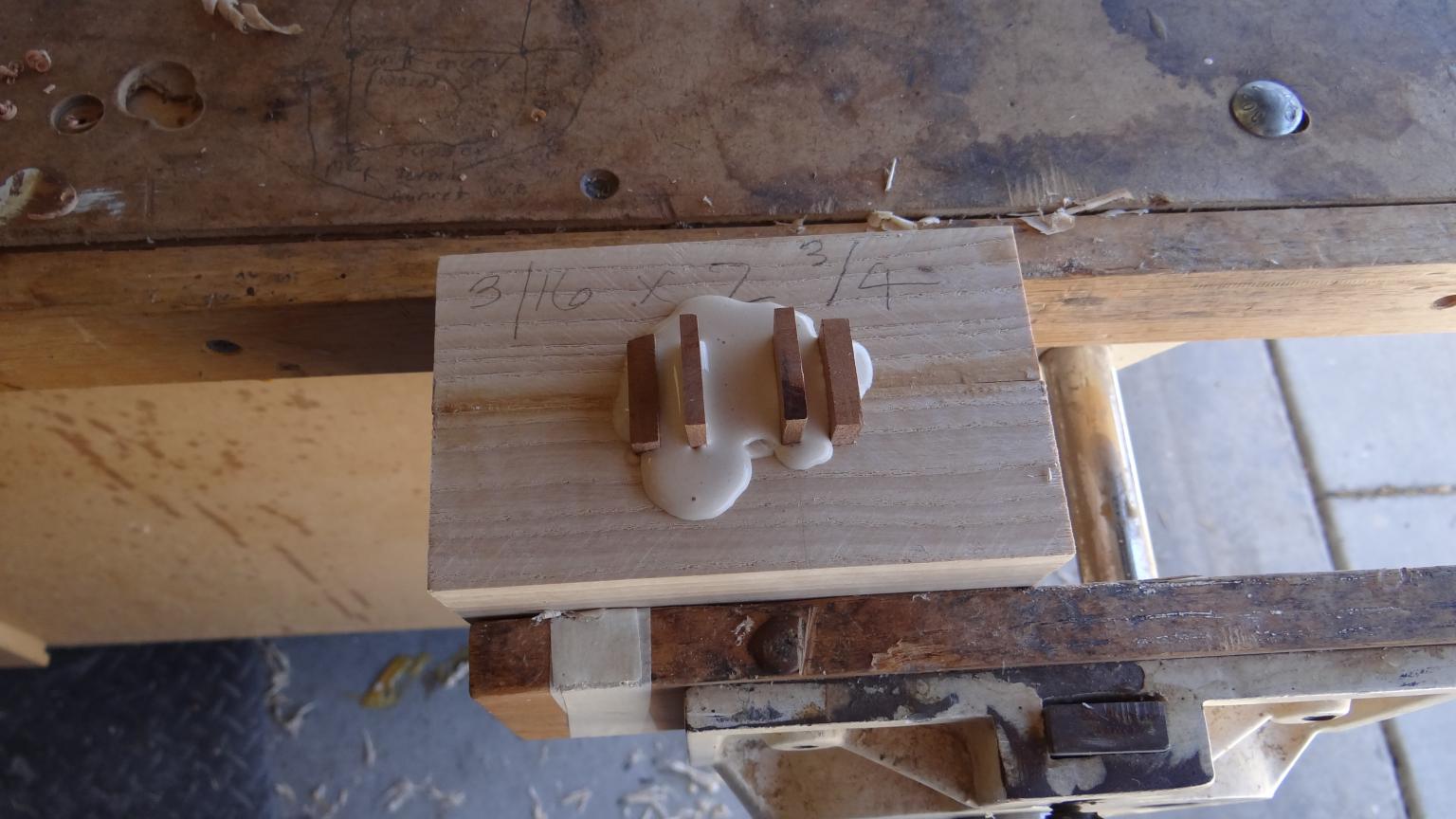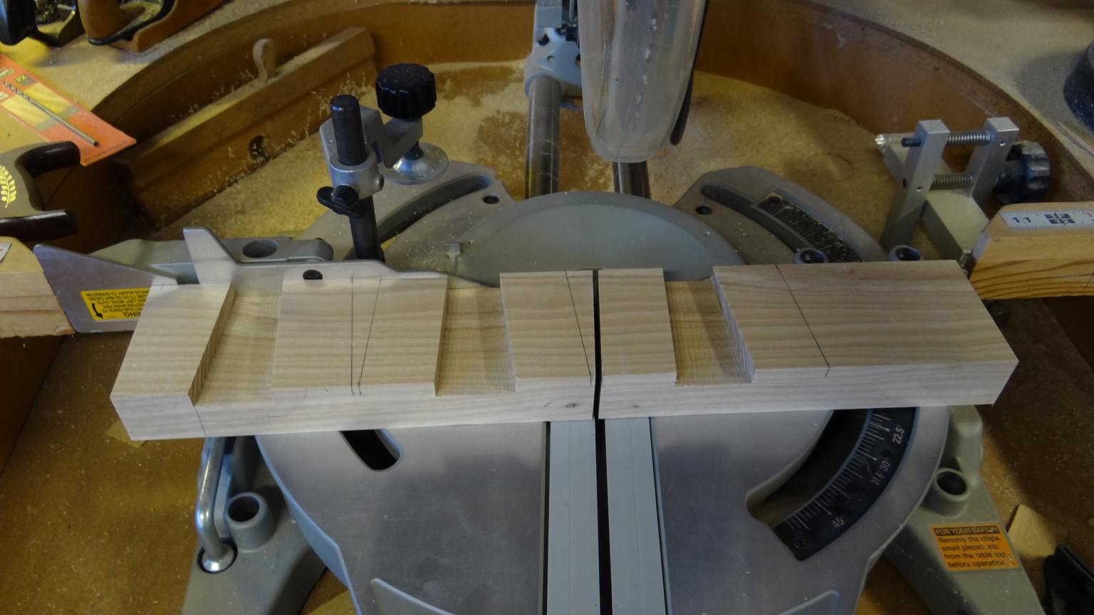 I had a little fun in the shop this morning. Soon I'll be firing up some chairs to build, and right now I am kind of jigging up and tooling up for this big project. Besides the jigs my son and I have been working on, today I got in the shop and made one complete mallet, and I have a couple more in the wings that need to be made as well. Before I took these images I had already made my layout lines and cut the mallet handle slots on my table saw. I simply set my table saw t-slot miter to 4 degrees and cut the slots in from one side then I set it at 4 degrees the other way and cut the other slot in the other side, then I hogged it out with several passes over the table saw blade. My 12" blades have 1/4" wide teeth so it didn't take long to hog the slots out. I laid out 3 mallets and gang sawed them. I cleaned up the slots with shoulder plane, the slots were heavily kerfed so I used the shoulder plane to knock the kerfs down, not all the way, but just enough to clean it up. I cut my lay out lines to produce the mallet blank halves. The key angle here is 5 degrees on the face. This allows your mallet to be used flush on a bench without your knuckles hitting the bench top but at the same time to have a sweet spot at the arc of your swing or tapping. Blanks ready to be glued up The handles are just dry fit into the slots. To get a great fit I had to sneak up on the handle widths, as not all handle slots in each mallet were the same as the next, because I cut these on the table saw without any jigs, just eyeballing lines is all. So each mallet was a tad different. I had to plane each handle to fit each slot right. I'll have a better assembly process next time, I plan on making many of these and pass them out as gifts and possibly sell them as well. A dry fit looking at the top of the mallet, the slot is tapered, so the bottom is tight and snug, the top is flared out leaving room for the wedges to secure the mallet. When I do these again I'll cut the slots so there is not much of a flare out at the top, it's really not needed. I think a 2 degree slot flare would suffice next time instead of the 4 degree. Lots of glue in around the handle, and on the wedges, I wanted the entire slot filled with either wood or glue, securing it for life. I tapped the outer wedges in just a tad, and I drove home the two center wedges pretty hard. Keep in mind, if you make a mallet, the wedges must be tapped in perpendicular to the grain to avoid splitting the wood. Cleaned up the glue a tad I used my bow arc to make the arc on the top of the mallet. Was an arc needed? No, but the mallet looks better with some shape to it. The arc All the edges of the mallet were chamfered with my block plane and the handle of the mallet of was shaped using my draw knife and a card scraper. The finished mallet at the right, and my two roughs waiting in the wings on the left. I put a very heavy coat of Watco Danish Oil on and wiped off. Here is a fun picture showing the hand tools I used to help make this mallet, it took a combination of my table saw to make the slots, the shoulder plane to clean up the slots, the miter saw to cut the blanks at 5 degrees, and my hand tools to shape and make it interesting. It's hard to see, but the chamfers I put into the handle and the edges of the head, are less than perfect, but that's alright, it's a mallet! The most difficult part was shaping the handle with my draw knife, ash is so brittle and grainy, it shapes horribly with hand tools, so I had to follow up my draw knifed handle with a card scraper. I'll be finishing the other two tomorrow. The main reason I built this mallet was for my chairs, I can't use a regular steel hammer without leaving marks, and a rubber mallet bounces too much. I already gave this mallet a test drive and I also used it on some chisels, I love it. I did not use any plans, I just read up on the required angle of the face of the mallet, and made my mallet thicker than the average. Most mallets I looked at were in the 2 3/4" thickness range, I made mine at 3 1/4", and I am glad I did, it has a nice big face. Thanks for following along!