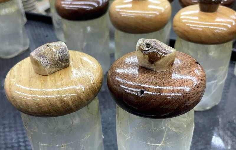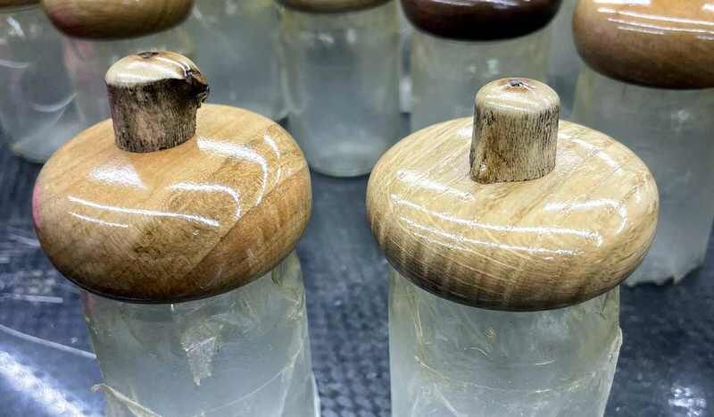 Just finished these little lids, they are small. About 2.25" or just less than 60mm in diameter. The gift shop they go to sells loose tea and herbs in bulk. The owner wanted these little lids to dress up 4oz mason jars. Sycamore limbs are ideal for making a natural or live edge knob and the trees are always providing material to work with, always. The natural edge knobs go quickly and it occurred to me to try doing some of the knobs cross grain. Pretty happy this look and anxious to see what Cindy (shop owner) thinks of them.