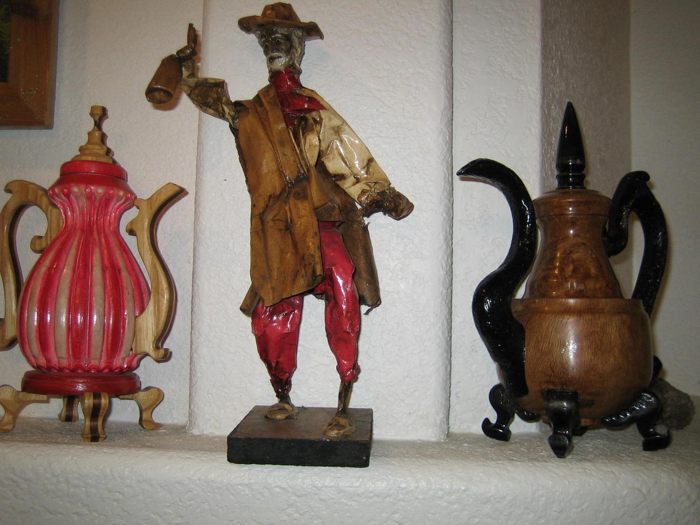 Bought this guy in Juarez about 1969. We use to drive across from El Paso at least once a year. Buy a trinket or two , eat some food while there and maybe go to the the dog races, drive back to those long lines trying to enter back in to the states..and become an inch worm for about the next three hours... I never worried about being over there and did stop at the Sanborn insurance agency and get a three day insurance policy each time just in case someone wanted to run in to me and get some kind of a monetary reward because of me while there...That never happened though. But we did get our windshield washed at each stop light.. Every time we were there they would have something different we just had to have and this guy is amazing and I had to have him for he was made using paper and glue..and maybe a small piece of wood for him to stand on...no stain or dyes were used. The colors came from colored paper. And a piece of rope for his shoes.. The best priced things were always things made with leather and also things using marble or granite... We use to enjoy those trips but later on when the drug wars got out of hand it got to the point wifee and myself decided those trips could be a thing of the past... I always said if someone can do something then I can too..But just never got around to it, yet! He is still on my list of things to make.