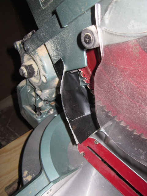 Part of the new shop build is going to be a better miter saw station. Dust collection always seems to be a problem with these guys (I guess Festool might the the exception, but I'm not spending as much on a miter saw as I did on my Unisaw) Anyway, I did steal a Festool idea. They have a little rubber(?) flap that channels the chips from the saw blade into the blade cover / vac chute. My Hitatchi saw didn't have one of these. I did have a little plastic piece that broke off very early. So I fashioned a chip director from duct tape. Seems to improve things a bit . A second thing was to get a $20 shop vac on sale at Menards, hook it up to a master-slave switch so it comes on when I pull the trigger on the saw and runs 3-4 seconds after I turn it off. I have a poor-man's dust hood (moving box) that is just so-so and hope to build a better one with the miter station. Anyone else have a clever solution? It's currently close enough to the dust collector to run another 4" line to it, somehow.