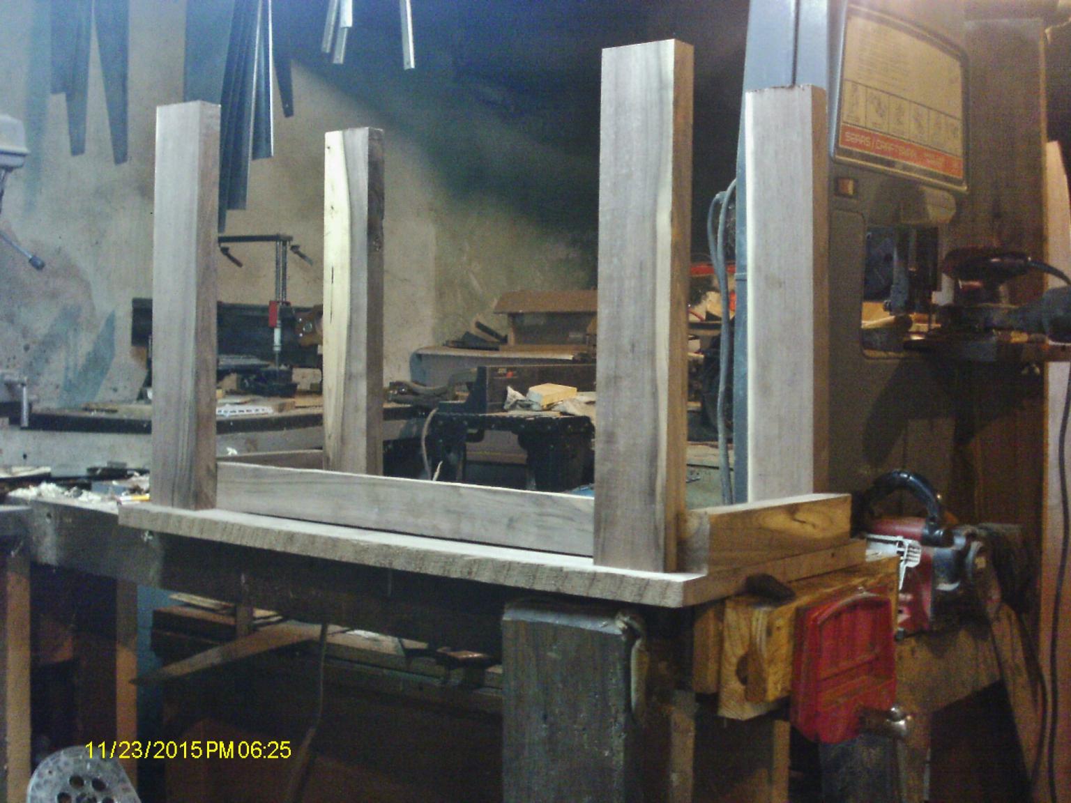 Well, inventory of the walnut slabs showed there just wasn't enough there to make a Hope Chest.....soooo, we can make a fancy table instead? Got the clamps off tonight..and grabbed the Stanley No.7c New handles and all. The board on the far side had a hump in the middle. HAD. Jointer plane made a bunch of shavings... But....seems there was a high spot along the glue joint, and the Jointer plane just glossed right over it. Hmmm, well, a few swipes with a cambered Jack plane removed the high spots, then a few trips with a smooth plane to clean things up.. Got both faces smoothed out. laid out some other parts, to check for lengths.. Legs and a couple stretcher/apron pieces. Had to allow for tenons. Cut a few more. Circular saw was faster, but didn't quite cut square. We have ways to make that better... Not only will it cut square ends, it will give you a Cardio Workout as well.... laid out more apron stock. First of four long aprons is cut to length. Will have to rip and crosscut three more like it. End apron needs tenons cut. There will be a thicker "stretcher" near the bottom. I will need to do one more panel glue up, too. Seems the boards are a little skinny at 7" wide. need a wee bit wider one for the bottom shelf. Will also fire up the bandsaw, as a lot of curvyness will be going on. Curves in the legs, and aprons. Not sure about the top, just yet. Edges are another design point for the top.....options? Curved? Ogee/round-over? Leave as is?, Bevel the bottom edges for a thinner look? Plan....what plan? The page for the "plan" is still blank. Single Brain Cell Sketch Up tends to work that way.....stay tuned....