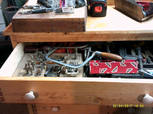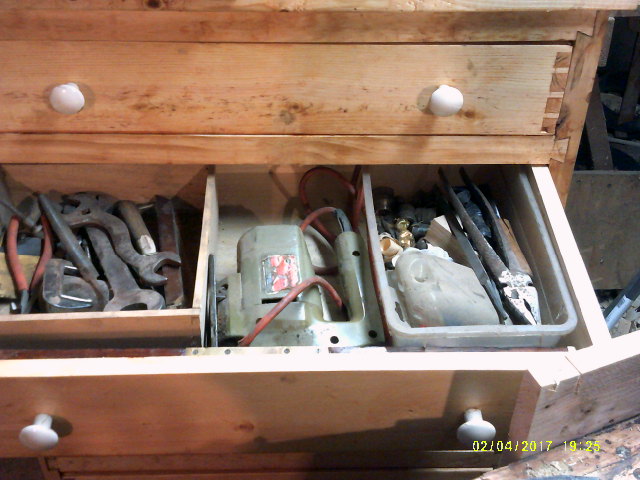 Well, since the Storage Dresser is now done, time to start the next stage of the remodel. Moving day, day 1... Cleaned all my stuff off all the appliances down here. So, where did all the stuff go? Top drawer filled right up, and it even closes.....ooh, ah! Second drawer down is almost filled up, and it also closes... Eh, not quite full, yet? Will have to work on that, I guess. Fourth drawer down is empty, at the moment. Bottom drawer has the "Book of Auger Bits" and not much else...I still want to be able to MOVE this thing.....as for the top? This will have to do, for now...... Monday< I'll see about getting a couple friends to haul that old dryer out, and to the Salvage Yard. Last time, one of these brought just over $9..... Then I can slide the dresser over, and into the spot the dryer was in. Then, we'll see what else needs moved, cleaned, put away...