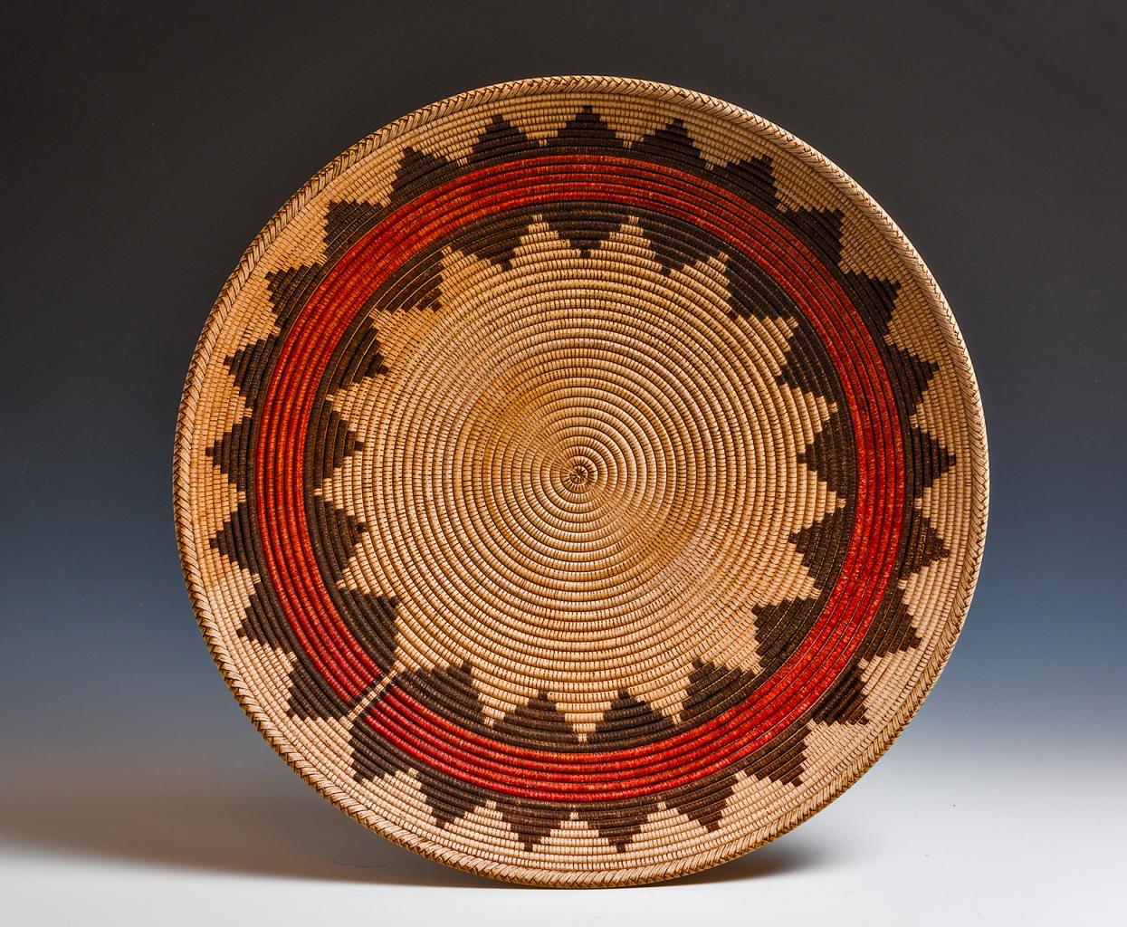 Here is my latest basket illusion piece. It is a 14½ inch diameter Navajo style wedding basket. The wood is maple that has been beaded and then woodburning pens were used to create the woven basket illusion. Copic ink pens were used to color the pattern which is the classic Navajo wedding basket design.