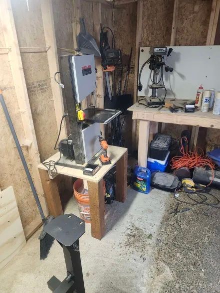 Hey guys I know its been a couple weeks since I've really posted on much. How ever I did order my CBN wheels from Wood Turners Wonders. Still waiting on my 180 grit CBN wheel to get shipped out. How ever On that note I've been very very busy destroying scammers I do have audio cuts of that which is NOT family friendly so I cant share those on the main page but if youd like to listen to some of them please feel free to private message me. On the second note. I've been re arranging my work space entirely. I managed to find ONE Delta Midi Lathe Stand LEFT. So I wound up paying hefty for it. Bought that stand and extension for it and threw it together in the house pretty light weight yet movable. It also sets at the right height for myself it will be much much much easier to work around than having the lathe directly mounted at a 90 degree to the wall and on a bench. You don't have much move around room to work with. The only things I got left for that is to basically bolt it down to the concrete. Yes I do have 1/4 inch wedge bolts. I figure 2 wedge bolts per stand leg side should do the trick. I've also built another work bench and basically demolished the work bench that I had the wood lathe sitting on. I am all about using the previous material for new projects instead of throwing the old stuff out as waste especially if its still in good use condition. I am also placing up some junk wood up on the walls so I don't have to deal with getting turning shavings into the areas in between the wall studs. That and doing IT work on phones has kept me pretty busy. Here are some photos. Fyi my work space is a bit on the cluttery side at the moment but been getting rid of a lot of stuff and getting stuff organized. That is why I also haven't been doing much turning yet.