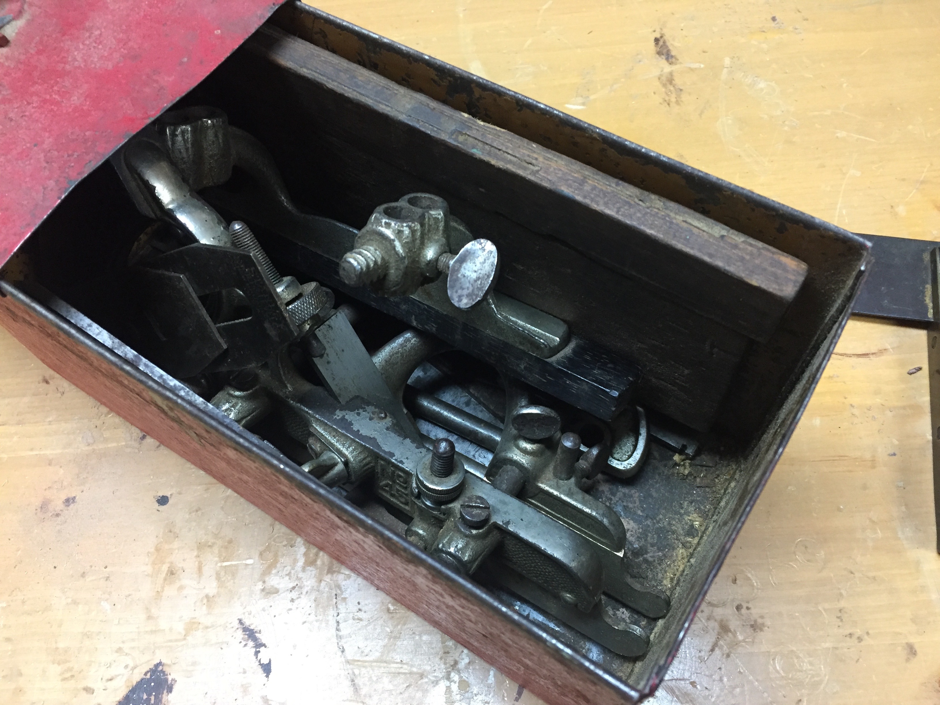 It has been a while since I was out Patriot Picking, but Tuesday, my wife and I made it down to a flea market and I ran up on this Stanley No 45 in the Metal Box. I currently have one with an 1890's patent date in the wooden box and got to looking at this one and it spoke to me so I had to take it home. It looks like it had everything in the box with the wooden holder for the blades along with several other blades laying loose in the box. The box was in good condition and the lid fits nice and tight. It has been used, but doesn't appear to be abused. I am looking forward to cleaning this one up. It has a patent day of July 09, 1901. A nice find and look forward to getting it going.