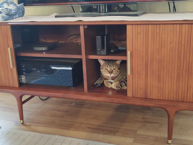 Over this last weekend I installed a Pella. Pretty straight forward, remove old inserts from old aluminum frame, set new window and secure in place. This is our dining room looking out to our backyard. That block wall is our property line, that tree is a very messy China Berry I planted a few years back, I'll never do that again! Lady was supervising me, she was making sure I was doing it correctly, and she was also doing double duty guard dog as always. The window went in pretty straight, but nothing is perfect, so I had to shim the casing/trim to give it the trim the appearance that at least it's squared up to the surrounding walls and level with the window above. I know it's a dark shot, but no matter what I did, I couldn't get a clear image with the natural light from the outside. But there is the casing/trim in place. It's just simple farmhouse style, I used pine from the home center, followed up with spackling the knots, and caulking the butt joints. This is the easiest type of casing to install, no crown, just straight boards. I'll paint is this coming weekend. I don't like working with the prepainted MDF, I prefer hand nailing and it's hard getting nails through the MDF, and I don't like the MDF dust created while cutting. The pine was much cheaper too, but I had to put a bit more labor in for filling knots etc. It was nice to see our home clearly from the outside now, and clearly from the inside to the outside. We haven't had a clear view since we moved in and pretty much kept the blinds barely open because our windows were so ugly with hard water deposits and a window tinting job before we moved in that went wrong. We'll install blinds, no curtains. My ShopSmith got some good use, had to rip the boards for proper sizing. One of our two cats, Juniper, was also supervising the operation. My official dust collection for my Smith. It actually worked, don't laugh! I'll keep this topic up to date with the paint job! Thanks for reading!