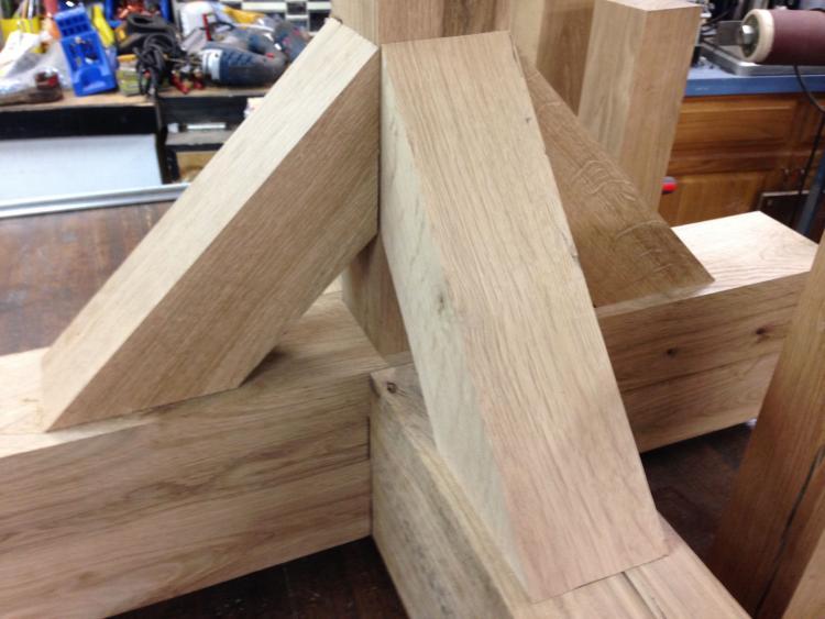 Well this project took me a lot longer than I ever expected. I was ask to build this right after my knee replacement and I thought I could do more than I really could. So it took me a while to admit I just didn't have the strength and stamina to work on it and it got put on hold for a while. My customer was okay with it, they were in no hurry to get the table. So let me start here. I was ask to build this table out of reclaimed lumber. I don't have any reclaimed lumber or at least I didn't think I did. I met my client at the wood stash to look at what I had and pick out something for what she wanted. Here is where the story get interesting. Her father is a retired pastor and a local church in our area was about to go under. They were down to 20 members and he just hated to see it close. He called the pastor or our church and as it turned out, we adopted them and are working on rebuilding the congregation. When our church took over the facilities, we took out all of the pews and put down new carpet and they decided to spread the pews apart so they wound up with four they didn't need. I got a called and was told I could have them if I would come right then and pick them up. I did and stored them at the wood stash. So while she is looking around, she sees the pew parts and ask what they were. I told her and she said that is what my table needs to be made from since my dad had a part in saving that church. So this was one of the seat sections that would be used for the top. Here are the sections cut down almost to size. Along with the table were to benches to fit into the corner of the Breakfast area. I got on those and built the framework out of 2x4 lumber. We took more of the seat section and made the seat for the bench and we took the backs of the pews and made the front and sides. They were delivered and put into the corner of the Breakfast area. So then it was back to the table. I was sent a picture of the table she wanted for this area and the only one she found had a round top but she wanted this base on the table. I was ask if I could do this with a 48" square top. Now I usually just get dimensions and work from my head maybe making a slim sketch while I work but this time I decided to sit down and draw out this table in SketchUp and add the dimensions. So that was my working drawing for this table. I got some old beams to make the bottom from and they were some of the first pieces to run through the new 8" jointer. After jointing and planing and cutting to size I make the half lap joints for the base. Then the ends of the braces were rounded over on the bandsaw and sanded smooth. I then cut all of the 45 degree support pieces. A quick Dry fit after a new fence for the SCMS and all was good to move forward. With everything cut it was time to start the assemble. Beth was in the shop to help me with the assembly as this table started getting heavy pretty quick. Assembled we put the first coat of Minwax Dark Walnut stain on to match the Oak Church Pews. After about twice as long as it should have been I finally got it dry enough to get the second coat on and then wait a little longer. The finish coat was General Finished Endro-Var which I really like in the Satin finish. Last night I installed the top using figure 8's and attached the trim around the top that came off the pew edges. So now the table is finished and ready to deliver. It has been an awesome project. Thanks for letting me share it along the way here and to give you a final wrap up. Well I will post one more picture after it is set in place with the benches.