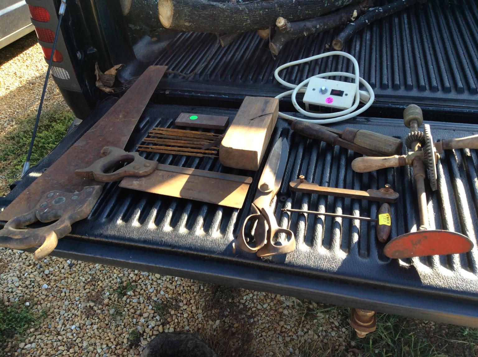 In spite of harvest activities, We have made it an annual activity to go out the second weekend in October for a fall festival somewhere. The last several years, it has been Illinois' Spoon River Drive and we did so again this year. The day was beautiful and I found a few cool items too! Most of these items were 1 or 2 bucks and were found at roadside sales throughout the drive area. The group of vises and the rotary table set me back 40 bucks for all. The egg beater is a Goodell-Pratt 259 and Millers Falls hand vise added 10 more. The drill appears to be very well built and has a ball bearing spindle, ratcheting crank, and shiftable gearbox. The breast drill I picked it up for parts. The pig stickers were picked to add some sizes to ones already in my shop and the back saw was a request from my wife's uncle. It is cleaned and sharpened and ready for him to take home. The leather shears are kinda cool and show an 1859 patent date on the brass cap. They also have been through my tank. And did I mention the NOS Saw files with superficial rust? They got an overnight vinegar soak and look very sharp and usable now. I will test them soon enough! There is also a skew rabbett plane with good iron and a broken wedge that will need replacement and a fence for an early Stanley 46. Family, food, finds, and fun! Not ready for winter!