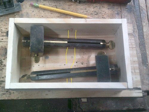 Remember these? That have since been resawn down a bit.. Faces flattened.. Marking gauge, the "New & Improved" one..to lay out for dovetails... Then a little bit of layout work.. Yep, I do "Pins First" then a wee bit of a saw... Chisels and such to chop out the waste, mark the tails by using these pins to trace around...saw and chop.. First dry fit... So, in 90 minutes of shop time today...rinse and repeat, until.. the other 3 corners are done... So, what will be going into this case? these 2 Stanley No. 77 Mortise gauges....yellow lines? I need to make a holder/rest for them long arms to sit on/in...will add 2 notches. Need to also cut a bottom panel..and work on the lid a bit After that? I might just see how fancy I can get? Stay tuned...