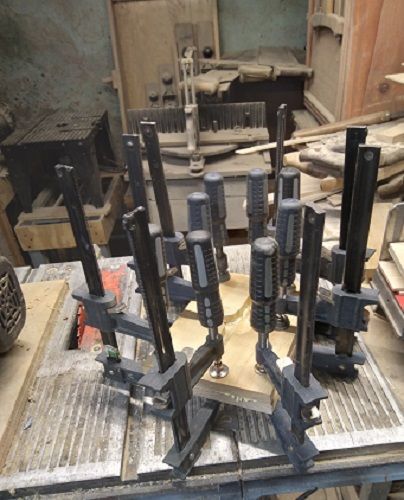 As it would be a nice place to store these things.... Has to be out of pine...Oak would corrode these...Need a scrollsaw.. And 3 pieces of 1 x 6 pine...like this one.. This one will be the lid of the case...planed because it is cupped a bit. May have put too big of a blade in the scrollsaw, was hard to make a few turns.. Will clean this up and out, tomorrow. Kind of hard to see..but... I wanted a solid glue-up.. as these 2 were also cupped,,,so I glued the cups together. Letting this sit until tomorrow..then plane it down smooth and square... I found a bit for a Brace drill that is a hair oversized...So I can drill out a spot for each Die....haven't decided whether I remove that one Die from the holder, yet. Still have these boards available.. 1/2" x 6" x 24" planks...Maybe a case for the "New Chisels"? Stay tuned..
