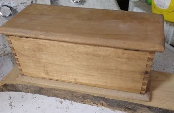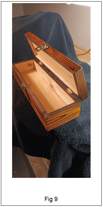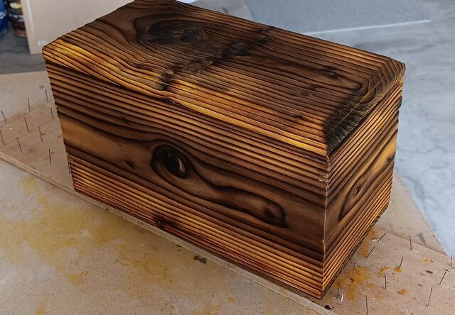 INTRODUCTION It's been a long time since I made a fully, all sides, mitered box. As miters go, It is the ugliest box I've ever made. I mean "butt ugly"! Okay...okay...maybe not that bad but challenging! I think many of us may take mitering for granted and sort of dismiss making a whole box this way. To tell you the truth, I don't know why I did and then to add insult to injury I decided to finish the surface with the Yakisugi technique or "Shou Sugi Ban" as we call it in North America). MAKING THE MITERED BOX I started by cutting all sides on my tablesaw. Yes!... my table saw! As hand tool crazy as I am, I couldn't imagine doing all these miters and bevels by hand (hereafter just called "miters"). My blood pressure is high enough. And then I still could not get the miters as perfect as I wanted all around. Even using my tablesaw! LOL. Then it dawned on me... I'm going to torch the thing so perfect miters may not matter! It is highly likely there will be some separation from burning and minor gaps on the corners. But it will add to the rustic look I was after with this technique. We'll see. Next... I glued it all up. I'm usually very strategic and meticulous gluing up. However by the time I completed mitering, I didn’t mind being messy and just slathered it on. Here it is ..... "Plain Jane" in Fig 1. BURNING THE BOX So why am I doing this? I dunno. I like challenges or maybe I'm just "bonkers"! Next, I started the "Shou Sugi Ban" process and torched all six sides, edges, and corners. I wasn't after a deep "alligator skin" burn but rather an even medium surface burn. Some alligator skin char was acceptable. The look I was after was the "Kimo - Tora" as some call it. This is a good site to see the different ones. See Fig. 2 and 3. WASHING THE BOX With the grain, I then brushed away as much of the dry blackened ash surface as I could on all six sides. Next I washed all sides with the hose and brush cleaning away the dirty surface. See Fig 4 and 5. APPLYING THE STAIN After it completely dried out, I decided I wanted to give it a yellow dye stain followed by shellac. I went everywhere looking for a small size can like 236ml. Do you think I could find it? And on top of this the ones I did find were like $15 -18. But no yellow or orange. Man 'o man!... things have really gotten expensive and limited. The heck with it!! Anyways I made my own using Tumeric. One coat on all sides was all I needed. However Tumeric is a fugitive stain. Though you wouldn't agree if you got some on your clothes or the rug not to mention your hands. LOL. See Fig 6 and 7 FINISHING WITH SHELLAC To prevent future fading it was sealed with four coats of blonde shellac. First coat was a one pound cut. Second, third, and fourth coats were a two pound cut. Then brass hinges and clasp was added. Here's the results: See Fig 7, 8, and 9 Hope you all enjoyed this!! Feel free to comment, ask questions and thumbs up if you like it! CHEERS! MrRick