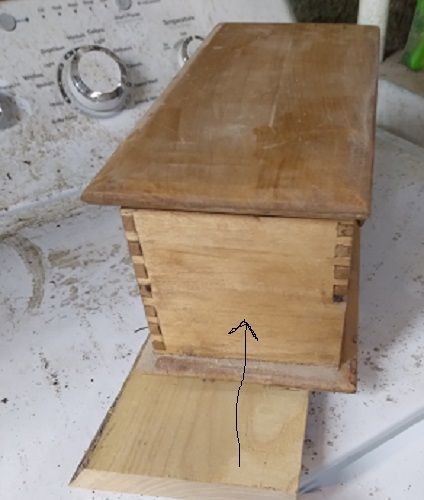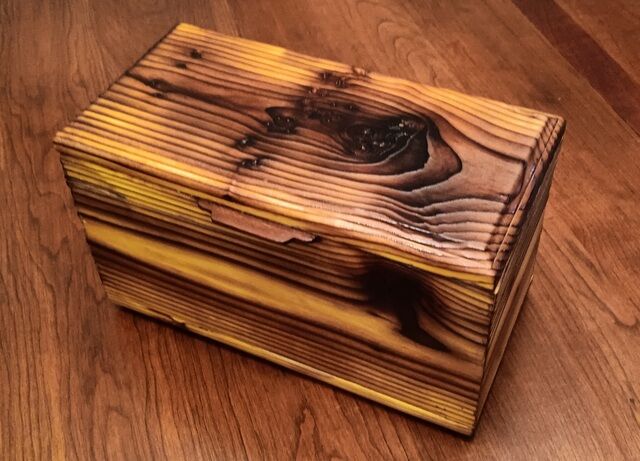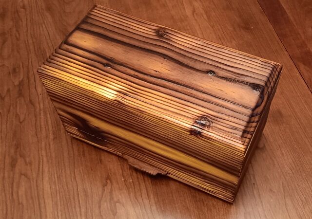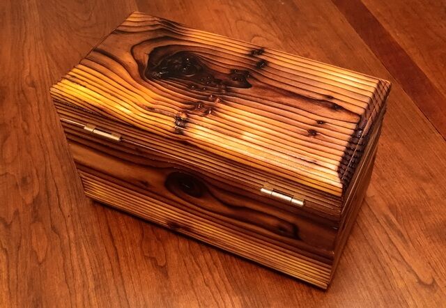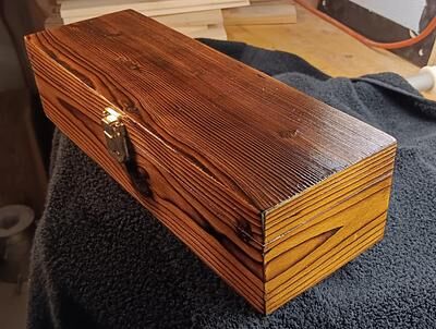 The Japanese have a wood burning process called " Shou Sugi Ban" With this Shou Sugi Ban process, I did a "Deep Burn" on a fully mitered Pine box. Then wire brushed it Zoom in and check out the grain. I then dyed it. Afterwards, I gave it three coats of 2 pound blonde shellac. I made a lift handle.... look closely. Installed brass hinges.... Here's a view of the bottom. Feel free to comment, ask questions and thumbs up if you like it! Thanks for looking! Cheers! MrRick