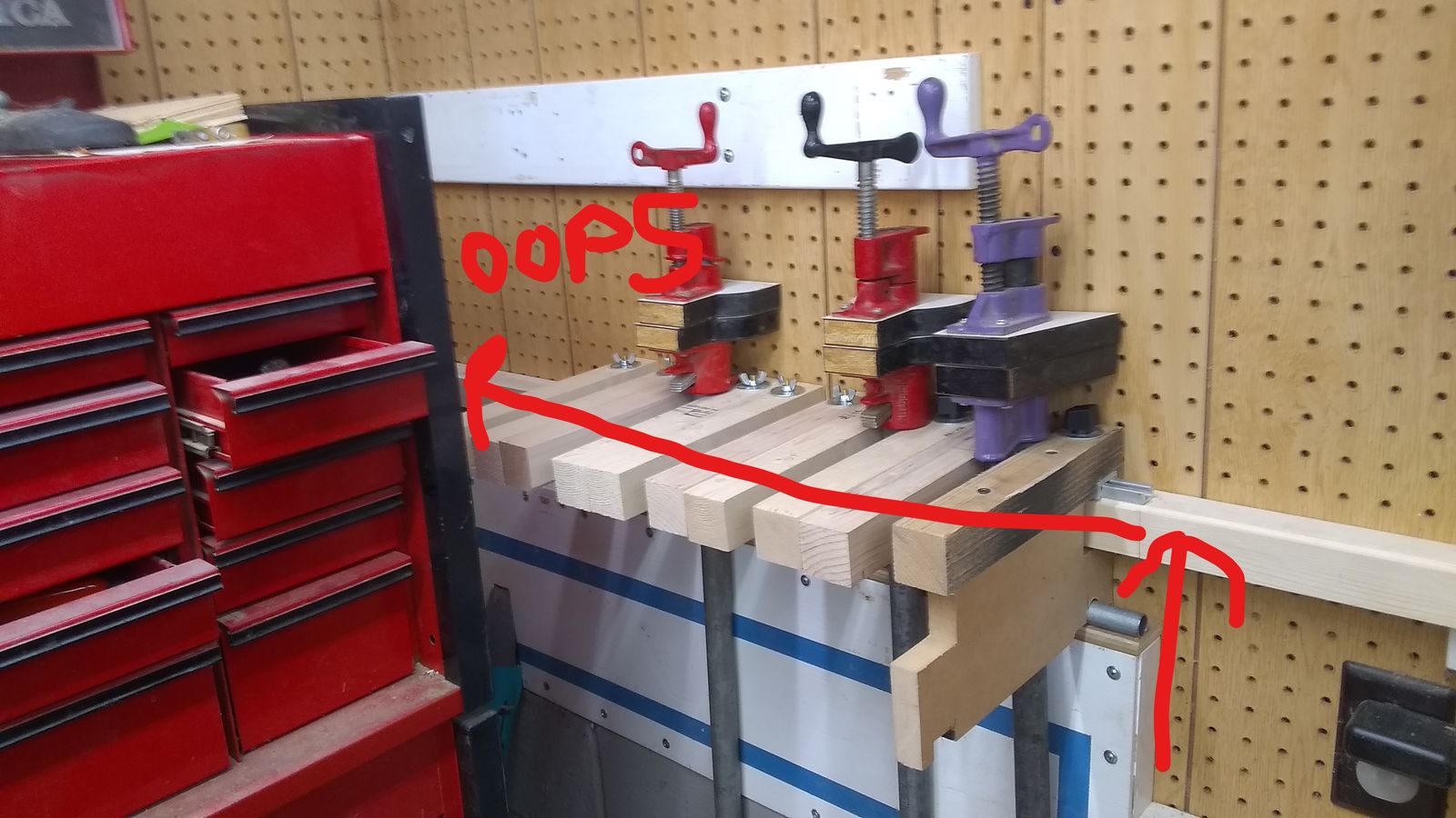 Had to move where I stored several pipe clamps I use alot to make room for a light over my toolbox. No one size fits all on this job. The 5 ft clamps are stored on this upper holder, non adjustable. Max clamps with my pads on them is 12, and that is full. Began with a layout. For this project I will be using some MDF and edge banding it with pine. Why? I had some on hand and this fit the bill. Next I loaded this up and left it overnight. So now we have it all painted up and some Formica put on the top. That done I moved on the the lower holder. This one needs to be adjustable to so degree. Now we hit a snag. I put this bar across the wall and checked the electrical diagram the old owner left for me. No wires in that corner where I am working, they are at the top. WRONG. Installed that 1 1/2 sq board all the way across and sank 3 inch screws into it in the corner. Hit the power wire. But did not touch anything else. No breaker blew. I found this when I went to use a outlet on opposite side of shop. It was dead. Tracking it back to between two outlets I saw that despite the diagram a wire must be in there,. No pictures, phone was dead and I was kinda busy. I took both side of that corner apart and found the wire. Thankfully plenty of wire was left to put wire in new location. So I made a new outlet in that corner and installed wire guards over the studs to prevent this from happening again. Never know might need it. With the walls now open I saw that the 24 inch studs had to be fixed. Cut down some scraps and put them at 12 inches on center now. Plenty of studs to hold stuff now! With all that back together I can now get back to work. I want the fingers to slide along top bar. So I installed some T track on the brace and then cut pieces of table saw t track to 1 1/2 inches for the fingers. Maybe not how they thought it might get used, but it works. The lower bar is 1/2 inch electrical conduit that is attached to the top of a brace. This helps keep the fingers tracking but more important it is solid for the brace to come down and take the load of the clamps above. I have 10 fingers to make, and edge band and then paint. Took a week to get all that done and finally assembled. Now we have all the pieces in place, fitting and ready to get to work. Green tape is for next project, you gotta wait for that I just got started. So after about 8 evenings and a solid day of work I have all my pipe clamps and other odd ball clamps in one place.