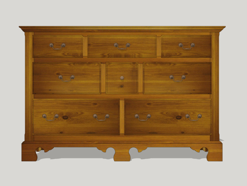 "Of course I have Plan.." Or so Boris always said. I took the time out today to do a bit of drawing on paper, using a pen and a straightedge. Resting the knee, of course. Anyway, I start with a few lines.. What you see here is the front edge of the corner post. The horizontal lines are webframes, with a face frame attached. . I will be using a couple 1x8 x8' planks to make the bottom two drawers. So that is where the 7-1/2" comes from. Face frames are dovetailed into the corner posts. Hashed lines show where the webframes sit behind the face frame. That little square is a Kicker, I add two to the undside of the bottom frame, and one in the middle of each webframe above it. After a while of doddling.. I come up with this...mess More to find out how long to cut the corner posts, and to get the spacings for the drawers. I also have to get a couple 1 x6 x8' planks, and a 1x4 x8' or two. Top will be a 4 /4 frame, with a plywood insert. I get one drawer out of each 1 x plank, and then add a 1/4" plywood bottom. All of this, to find out what size to cut four 4/4 x 3" posts. ( 42-1/2" long) So...about the sides these posts will make? Well, I mitre cut the foot. The Horizontal here is a rail/stile (?) that will connect the front and back posts at each spot where a webframe will be on the inside. I intend to use the sash cutter on the Stanley 45 to make a molded edge on the outside of both the stiles and rails. It will also give me a rebate on the inside. I can then add a plywood panel into the rebates. About five panels on each side. A tenon will connect into a mortise, the tenon on each end of the cross piece, and the mortise into the corner post. Page two also shows a few details of the webframes... Center piece is a kicker, to keep drawers from tipping down. Counter bores for screws, I can attach each webframe to a side with two screws. I can then come back after the case is squared up with a back, and add the face frame pieces. Dovetails on each end, and a line of glue to attach to the webframes. . Long time ago, IF I have all the lumber on hand in the old two car garage workshop on a Saturday morning.....by supper time that night, a chest of drawers would be completed, awaiting a finish on Sunday. Might take just a wee bit longer, now?