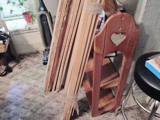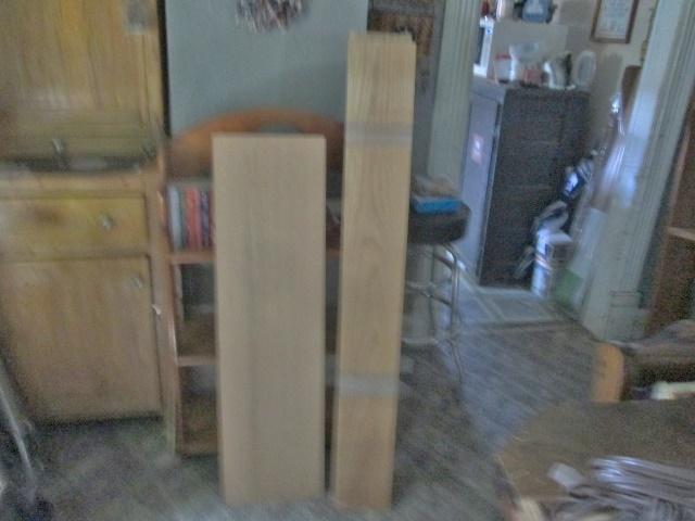 Ok, so much for a vacation from the shop.....The Boss has seen a Project she wants built.... Hmmm, more Flat-Pack....she wants this to replace this ugly thing.. When this was built, it was based on a 4 drawer Chester Drawers I was selling....then it became a pantry...and now a catch-all...open them doors at your own risk... Too tall, too wide, too deep, too full of... Already had some oak on hand.. 1 x12 x 3'6", three 3/4 x 6" and two at 3/8" thick x 6". Not nearly enough....sat down to make a drawing...while a second load of Oak sits around, getting used to the house... World Class Drafting Table? Tape measure to check a few sizes I need to match... Natasha: "You have Plan, Darlink?" Boris: "I always have Plan, they don't always work out, but I always have Plan" A front view. And, because i am frugal, and don't want to waste a second sheet of paper...flip this over.. Basic sizes called out. Locations of shelves. Cubby holes changed to Drawers...Oak? Counting what I had on hand..there is around 20bf of Oak sitting here...the new arrivals? Seem to have a bit of grain to them...and for me to work either around, or use... Drawer fronts? And.. Not all the grain I can use, though.. I will need some 1 x 3 stock....Hmmm. And the "bundle"...has a couple 3/8" thick boards...might be to build the paneled doors? Bookcase was built back in the mid 1980s...BTW. So...get the work jeans back on, tomorrow....and cut a few planks, and glue up a few side panels? Will do the base unit first...then the topper. Will see how long this project takes...stay tuned..