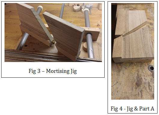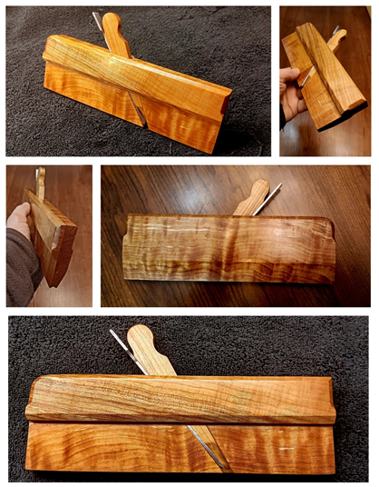 Introduction I enjoy doing most of my wood working projects with hand tools. I feel that I've become adept roughing stock with handsaws and squaring all four sides by hand planing. I've also become much better at joinery over the years with my favorite being handcut dovetails. One area that has intrigued me is creating mouldings with hollow and round moulding planes. Pursuing this has taken me down the road of making moulding planes. It has been a delightful pursuit. In addition, I make the blades or cutters and go through the whole heat treatment process. The Beginning I started by cutting two finished blanks out of Spalted Maple. These two blanks make the complete body of the plane. The first one (Part A) was milled to 5/8" thick x 3-1/8" high x 10" long and is the main body and left side in one piece. The second (Part B) was milled to 3/8" thick x 1-9/16" high x 10" long and is the right side that is laminated to the first piece. This plane will be a No. 2 ( 1/4") Round Moulding Plane. In Fig.1, it's mating plane, a 1/4" Hollow Moulding Plane sits on the right. It was used to make the 1/4" round groove as shown for the new plane on the left. When done this will make a matching set of 1/4” Round and Hollow Moulding Planes. See the closeup of the new plane's bottom in Fig 2. Mortising the Escapement Area Now it's time to mortise the escapement area for the blade's bed, cheek, throat, mouth, etc. I made this jig, see Fig 3 below, that I use for locating the bed angle at 50° and the wedge face at 60° on Part A. The jig has an adjustment screw that allows me to fine tune the mouth opening for Blade and Wedge. I can explain further how I use this jig if anyone is interested. Once I have the jigs placed where I want them (see Fig 4), I clamp them down on Part A to the bench and scribe the mortise cavity to be cut. Initially I cut the mortise cavity boundaries using my chisels (see Fig 5) Then I use my Lee Valley Veritas Large Router plane to excavate the cavity as shown in Fig 6 and 7. Here in Fig 8, I’m refining the mouth with the router plane. Fig 9 shows how I’ve clamped it to the bench while mortising. Laminating and Shaping Next in Fig 10, I laminated the Right Side (Part B) to Main Body (Part A). I then started chamfer detailing . In Fig 11 - 13, I am chamfering along the top edges and bottom edge of the Right Side (Part B). In Fig 14 & 15, I have done Stopped Chamfers for the front and back corners. The Wedge Next I shape the wedge Per Fig 16. As mentioned earlier the bed angle is at 50° and the wedge face at 60° on Part A. The wedge will be a 10° angle and is approx 6” long. Making the angle slightly larger initially then fine tuning to fit the mortised area is advisable. Detail A shows the curvature required for the shaving to climb up and out as you are planing. Fig 16 Per Fig 17, this is the notch, Detail B, for assisting in wedge removal. Blade This is the complete 1/4” round blade per Fig 18. I didn’t go into detail here with the whole process of shaping, heat treating, honing, etc. Again if anyone is interested and has questions please let me know. Fig 18 Finishing To start I coated all the plane body (except the bed) and the wedge with two coats of 50/50 cut Tung oil. Per fig 19. I let this cure for one week. Fig 19 Then I brush coated with two coats of Shellac and allowed to dry overnight. The actual sole is left only with the tung oil coating. After this, I French polished with shellac to make the grain “pop” per Fig 20. Fig 20 Finally per fig 21, I coated and buffed eveything with wood butter except the bed and bottom of the wedge. Here’s the completed 1/4” Round Moulding Plane per Fig 21 and Fig 22. Fig 21 Fig 22 Thanks for Looking! Cheers! MrRick