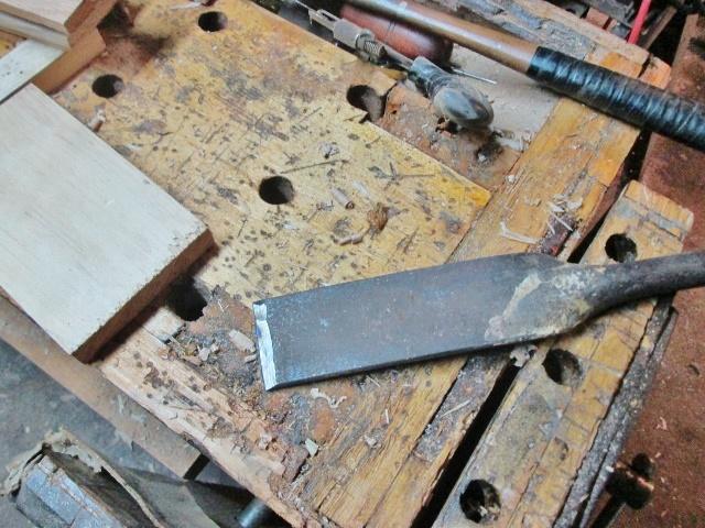 Ok, awhile back I picked a plastic tub of tools and such....in one of the many "layers" of toys in that tub, was a chisel shaped object. All metal, mushroomed tip, must have been hurting, tip is all red... Well, finally some free time in the shop, got rid of that mushroom.. Could even read all the writing on it..."Made by Crescent Tool Co." "Jamestown, N.Y." No. 175 1 1/4 Made in USA Hmmm, that might take awhile....bevel had a 40+degree angle to it, and was skewed.... Took a large cup of water to the shop, and set it right beside the grinder. VE Haft Werk to do..... Looking better, now. No attempt at a bevel..just straight in. And dunk it often. Once this was straight, I could work on a new bevel...at 35degrees.. And made sure the back was flat.. Will do....then the stones and papers.. A very coarse stone, until a wire edge showed up.. Bench dog to keep things from sliding away. Medium stone..600 grit..then the fine stuff Set each paper, 1000 grit, 1500 grit, and 2000 grit right on the stone. Sprtiz of WD40 on the stone, and the paper...then the leather belt strop, loaded up with the green compound... First test drive.. Yep, it will curl some shavings...but, this is not what this chisel was designed for...next test drive.. Say this is a floor, or ceiling joist, and you needed to run a water line, or electric lines through it...rather than drill a hole that may or may not fit..just chop your way through.....including through lath with brown coat, joists with nails..this chisel will cut through....and that be the hammer most often used... These were sold with a shiny blade, a blue/black handle, and a red top.. Just like new. Might have to find a use for this one, around the house...