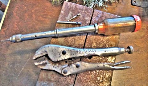Well, first we dropped off Craig at his job, then stopped to check on Mom......not a good time....Call button wasn't working....she needs help to get out of bed....so, somehow she now has a Urinary tract infection, too...along with too many painkillers. Got the nurses motivated, then my sister arrived, and really motivated them.... They were working on mom when we left....with my sister playing strawboss.... On the way back home from there, stopped at a store, for a little rust hunting....$9 +sales tax.. A little 8" sweep brace, with a "Bonus" of sorts.. A VERY minty Craftsman 13/16" bit. Got home, did a wire wheel change, and the cleaned things up.. Almost like new? Wonder IF Craftsman would replace it? As for that brace? The only markings I found, were on the chuck.. A Goodell Pratt, from Greenfield, MASS., USA....PAT. Dec 27, 1892. That "loop" is a gear shift. Flip it to one side, or the other, chuck now will ratchet, center it up, and no ratcheting will happen. I think I know where Millers Falls got the idea about the top attachment.. As Goodell Pratt used the same thing. Was kind of a so-so day....and 1-2" of fresh snow..grrrrr.