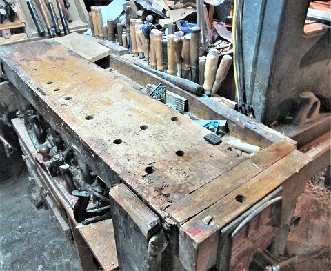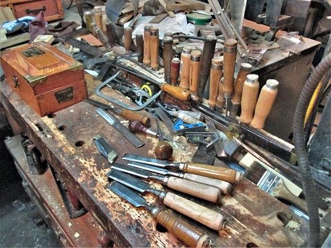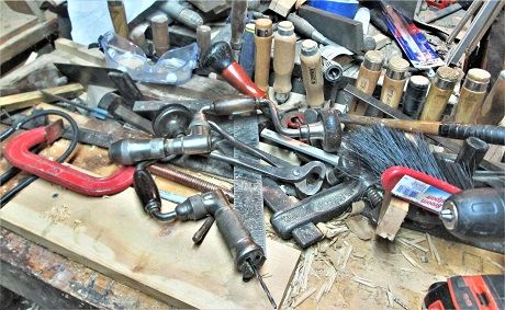 Ok, latest Project is about ...done. Time to clean up the bench, put away the toys,,,and maybe rehab a few items.. I can finally set this back on the bench....bench is a bit ...full... Over flow from the Tool Well? "Name that Tool"? How do you hang this thing up.... Every shop could use a 4-in-hand rasp/file....but it needs a place to sit, until called for.. Chisel shaped objects, at least the 3 in front...the other was rehabbed long ago...clean, sharpen, and re-do them handles.. May "refine" the other two....Scratch Awls were also cleaned, sharpened up, and a coat of finish brushed on... The rasp was cleaned of rust and crud, pocket knife was too..and sharpened... Anyone want to stop by and help out? Stay tuned..( may build a second row to the back of the bench storage rack....may need 2..?)