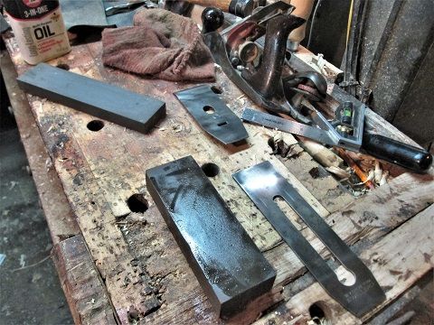 One of the "treasures" brought home from Wapak.. I've already rehabbed the Defiance plane, and cleaned the drills up...which left that wood bodied Jack plane... Needed a blade/iron/cutter.....Well, I did have a chunk of decent iron handy.. This is the half that is "leftover"...went back as far as this was flat....used the grinder to cut a deep groove.. Because this chunk of steel was laughing at my hacksaws...got as deep as I could, then snapped the "good" part off. Beginning to think someone had re-worked an old lawnmower blade. More grinding.....beltsander......more grinding...wound up with an almost flat "back" and a cambered bevel... 2" wide iron....could have been a tad wider. Will work on the sharpening later... Had to trim the wedge a bit....will refine the cut later. It was sticking up further than the iron was. Finish the sharpening, may see about tightening the handle a bit...finish the wedge a bit..will do for now. May try to find out how thick the iron is..... Stay tuned....