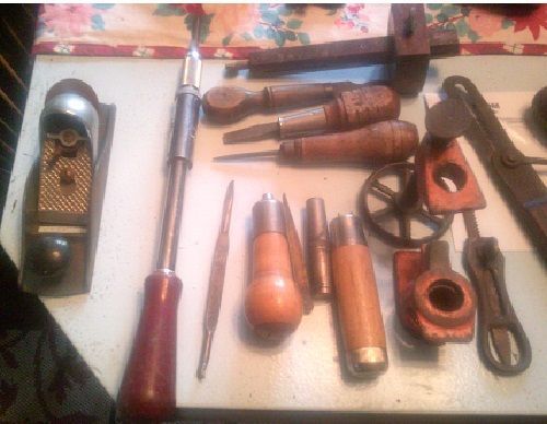 Thursday...a large, HEAVY box appeared on my front porch....opened it up, and spread the contents out, a bit..took up half the table's top...but.. The Ring? Goes on a finger, then you pull a strip of leather through..cutting a strip that you can adjust the width of... Guide Bushings, Craftsman router... A little bit of everything... That saw blade gave me a poke, during the un-wrapping.. C clamps, anyone? and a few squares..so...today's task was to clean and sharpen..and repaint as needed.... What had looked like a pair of tweezers was a solid brass pair of dividers 4" Tear the bevel gauge all the way down..shine up the brass fittings, shine the steel parts up...straighten the blade..give the sanded wood a wipe down with oil. Squares? Bottom one was from Henry Disston & Sons No.1, 6" try square..not too sure about the other 2..top one was a rusty mess...that is not the smallest block plane in the till..but very close to it. These look any better? No. 67 is now SHARP, Block plane is too..Turnscrew looks better,All metal square is a Stanley SW 6" Miter square..and as for that rusty double Spokeshave? Wire wheel clean, gloss black paint, both irons sharpened and set..Under the handle, and under the two cap irons is the No. 60...Early model Stanley? Saw has E.C. Atkins stamped on the blade. Depth adjuster on that block plane is NOT gray plastic...but a type of cast metal. The orange clamp is from PONY...and needs a bit of 1/2" pipe. The Craftsman Handle? Is to hold files and such. That metal cylinder, is hollow, and has couple of bits inside...that fit into a slot...in one case, it becomes a t handled Gimlet Drill...Those are not tweezers, that is the Brass 4" dividers...Not sure about the fat body handle..yet Unscrew the butt end, until a file will fit inside, then tighten things up. Holds the file securely.. First half is done...start on the other half, tomorrow? Stay tuned