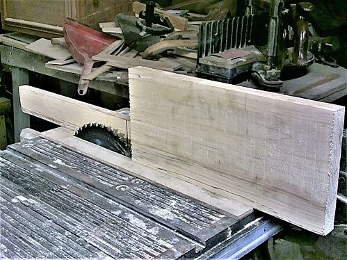 Lumber Run the other day...one of the boards was a1 x 6 x 6'5" plank of Maple....the other Maple was even longer...decided to see about a Project for October.. Sides are curved.. Fancy stuff.. However...sides needed to be 9/16" thick, not the 3/4" that the Maple was...lid panels are at 5/8" thick...need to do some resaw, it looks like. Hauled that plank to the shop, once the bench had been cleaned off.. IF I can hit me head on the way down the steps...imagine what this was like...had a few spots to work around, too.. Usual knotty stuff.. Even a "split end" Went to the cutting list...and started to lay out what needed to be cross cut.. Board was a wee bit too long to be cutting on the tablesaw, so.. we have ways..Disston D-100, just need a cut line to follow.. And work my way along until.. Left-overs? Will provide a 9/16" x 4" x 6" piece for the end of the box, to go with these.. Includes a "spare" side...but, these are all too thick...need to set up a kerf cutter, again.. Best face against the fence, run all 4 edges through...fence set at just over 9/16" for some cuts. and 5/8" for two others..blade does not reach high enough.. But, this will...just follow that kerf.. Until... "POP"...Repeat for the rest of the sides.. Will work on the other 3 parts later...will need to plane these smooth.. Before any joinery can start in.. Stay tuned..