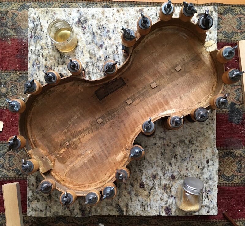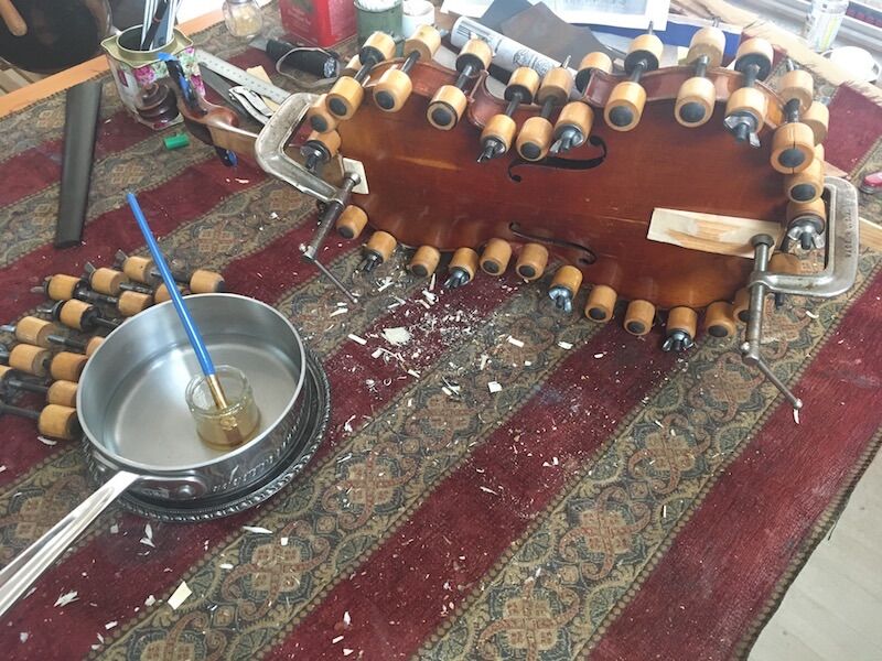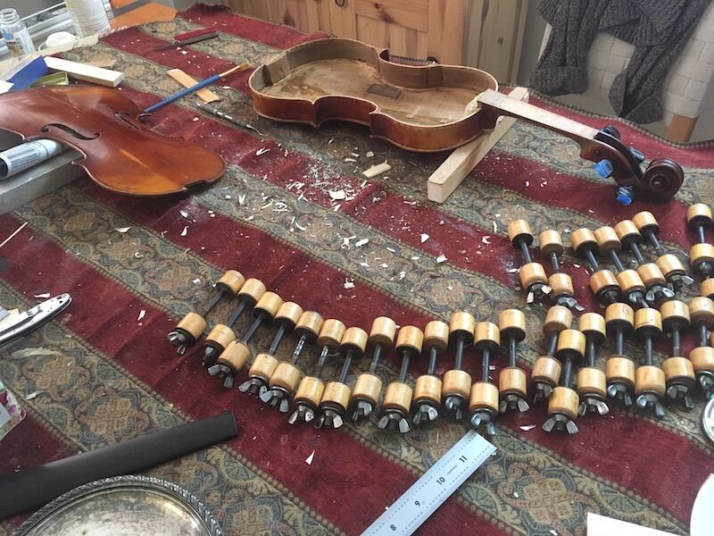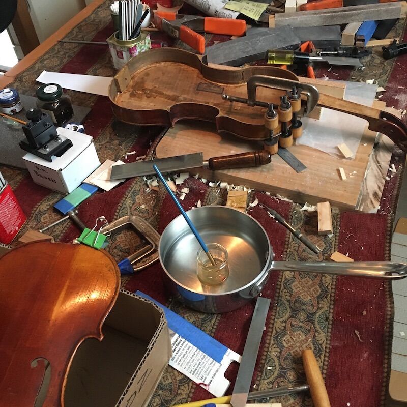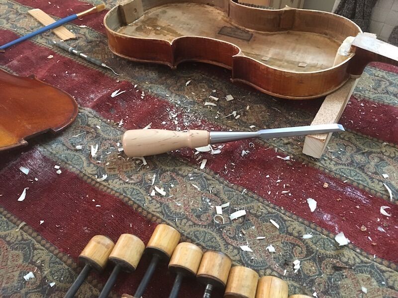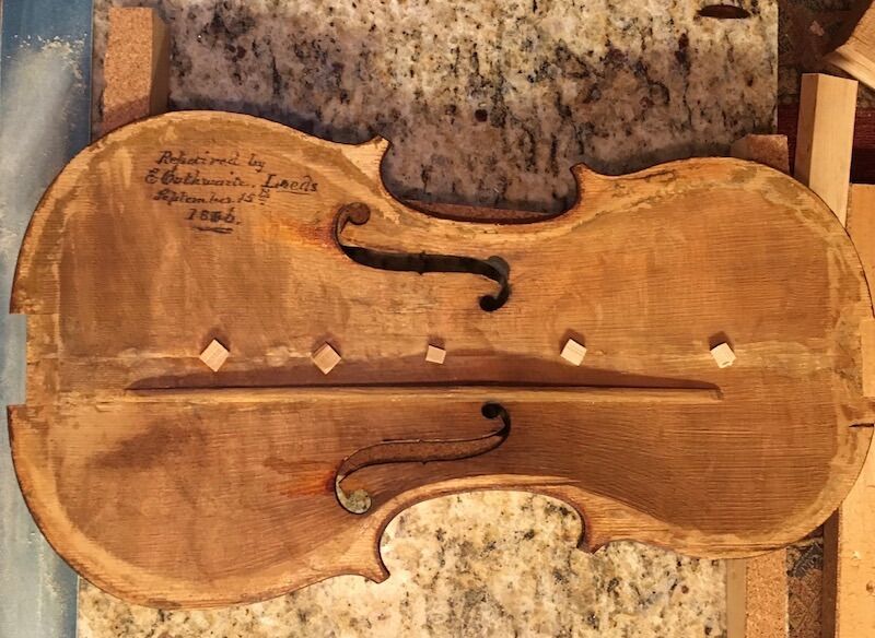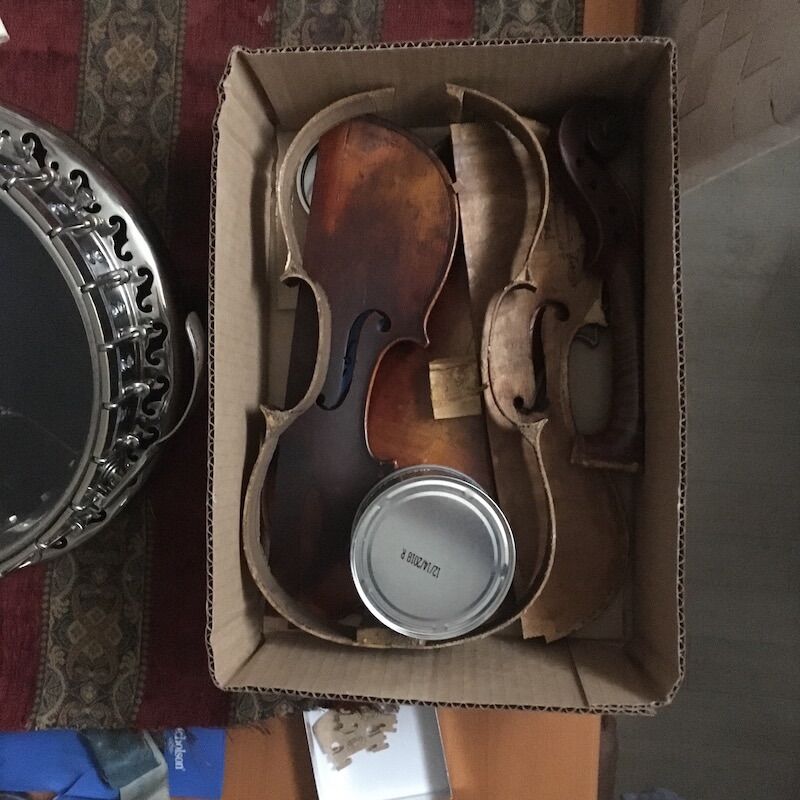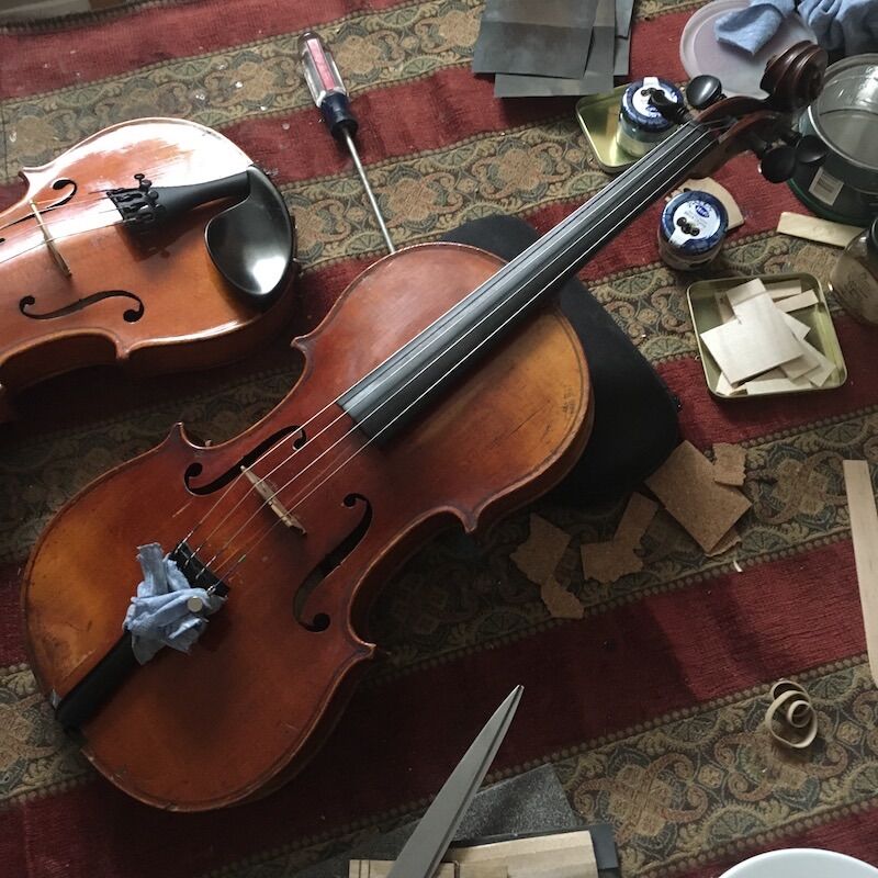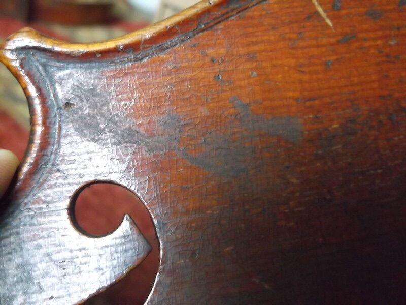 As promised within the Use of an Angle & Taper Calculator in everyday woodworking thread, here's the amateur hobbyist play-by-play of restoring an old violin. This old fiddle came to me in its original or so coffin case and promptly fell apart as soon as I removed the chin rest. The first 20-some images chronicle its condition with attention to tool marks. August 14-15, 2018 Gut strings! Keystone-shaped dovetail-cut pegbox repair, likely c.1880s. Wow, lookie that patina! This violin is not a Kloz, not remotely built as a Kloz, certainly sounded nothing like a Kloz, I've reliably been told. Likely an authentic repair marking, this work failed, maybe around 1920; the glue I removed was oddly sticky with a sharp astringent odor. All of these images are used to date and identify the fiddle. It is thought to be mid-1800s, a build of the French Mirecourt region. Cannot fake this crackled spirit varnish with embedded dirt / rosin. August 23, 2018 Spent some time cleaning up the top, meaning glue edges and whatnot. Then reassembled the ribs to the back. Cleats ("jacks" to the Brits) being glued. I shave them flat and scribble a few notes on them which get sanded off. September 11, 2018 By mid-September 2018, a new end block is successfully crafted after eleven tries. Working backward, I glue the block to the heel neck. Most or all violin neck heels are cut squarely, a big tenon, the end block is a big mortise. This joint is dovetailed, so I keep it as-is - cleaned it up and sharpened the edges. Officially my first "neck reset". Wowwie, look at that neck angle! What about the projected height of the strings !?!?! The violin is back together about five weeks after I received it, strung up with used $80 strings. The old end block on display. A new bridge is on the violin. It is 40mm high, a good centimeter higher than specification. Way too high for a practiced violinist, but bringing the fiddle to a bluegrass circle, I note the higher string angle does produce a great tone. Even, dare I say, a fantastic tone. Mo' downward pressure. But it is not sellable at 40mm. 29.5mm - 31.0mm is the range. My projected height is all off. Image sequence was thrown off, but the top is removed, the end block pried off, and the neck reset. My second official neck reset. Thank the saints I am using my own hide glue through all of this. In this image, which I *think* is in correct sequence, one may see a slight difference in neck angle. Hard to tell, but I was off by a little under 2˚ And she's back together a second time. New pegs in newly-contoured peg holes of the modern** 1:30 taper. New fingerboard and nut all pictured here. ** modern since the early 1900s, replacing 1:20 taper or whatever was traditionally used in the shop. New strings this time. $40 D'Addario Helicores. The pegbox repair was undone, cleaned up, and reglued using the same piece of wood. I *may* have used Titebond on this one joint, as it represented something I never ever wanted to come undone again. All the other joints are hide glue; in theory, a violin may be taken apart and repaired indefinitely. Hope you enjoyed the tour. - jim