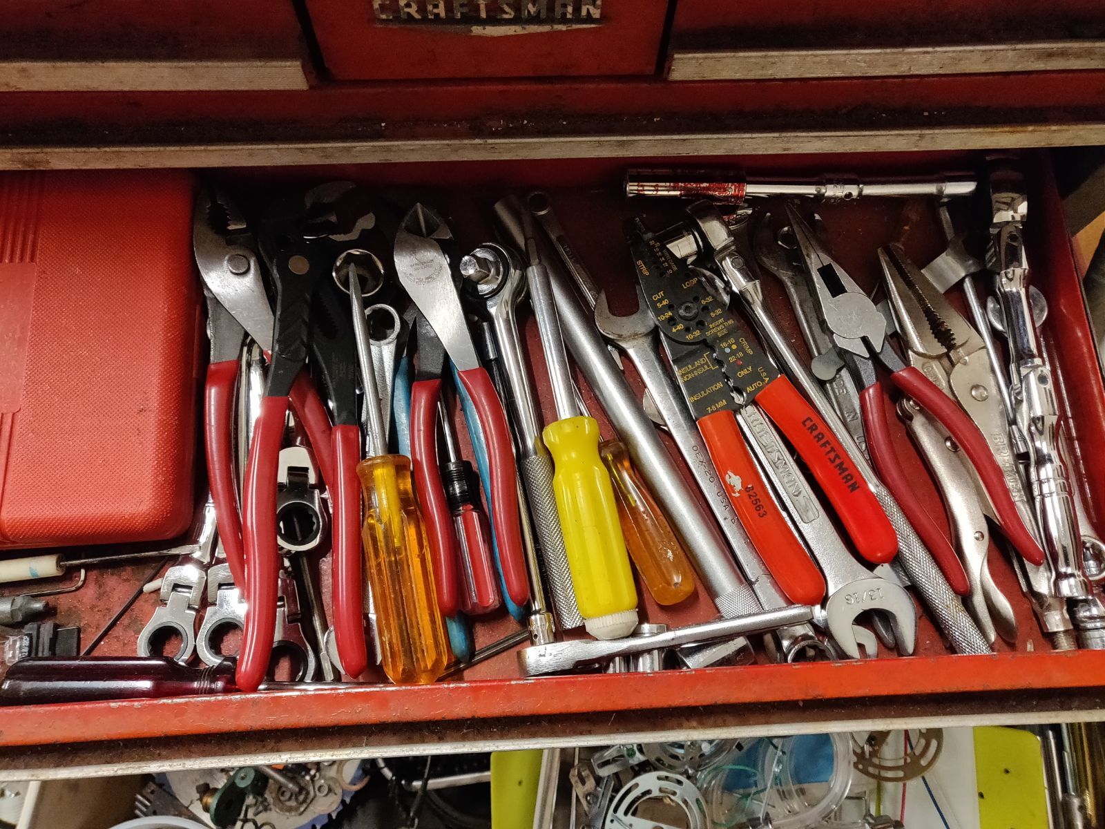 just for the heck of it my primary drawer in the little tool box at the restore with the tools i use most frequently to de-contruct lights, fans, etc for re-cycling of the metals. since i am a volunteer there,all the money we raise from this goes directly into stuff for new homes. included are 12, 13, 14, 15, 16 mm wrenches (with the 14 being the most commonly used on 3/8 pipe nipples holding lamps together. that long tubular job in the middle is a 10" 14mm deep well socket (originally for certain Denso plugs). 1/2" pipe normally held in place with 11/16 nuts. red handle pliers are the HF replacements for my Knipex pliers which i leave at home now. 1/4 ratchet set up with 6" extension and 1/4" 8 point (square tip bolts often used on ceiling fans) and 14mm socket on wrench to right for lamps. various screwdrivers and a box of HF tips to the left. other drawers have my Wilde pin and roll punches, SAE wrenches and sockets, metric wrenches and sockets, cut-off wheels , and a load of other miscellaneous small tools. hammer and large screwdrivers in to as well as a couple of specialty lamp tools (for removing retaining rings).