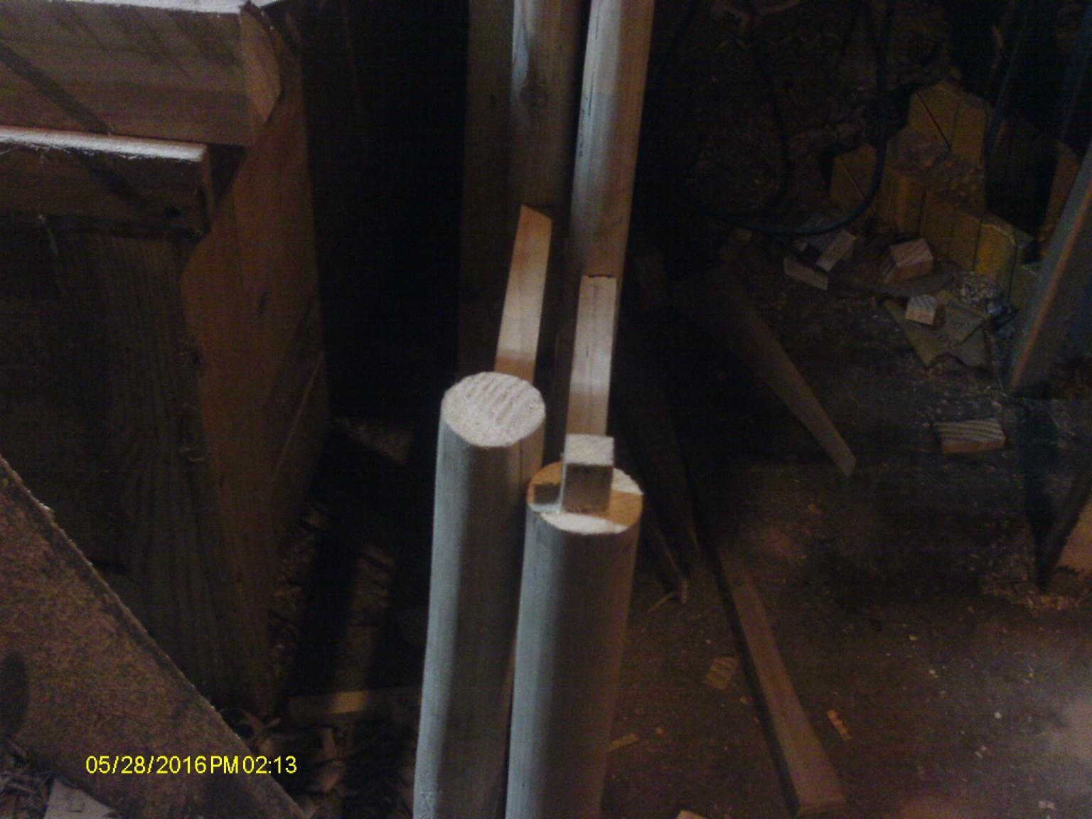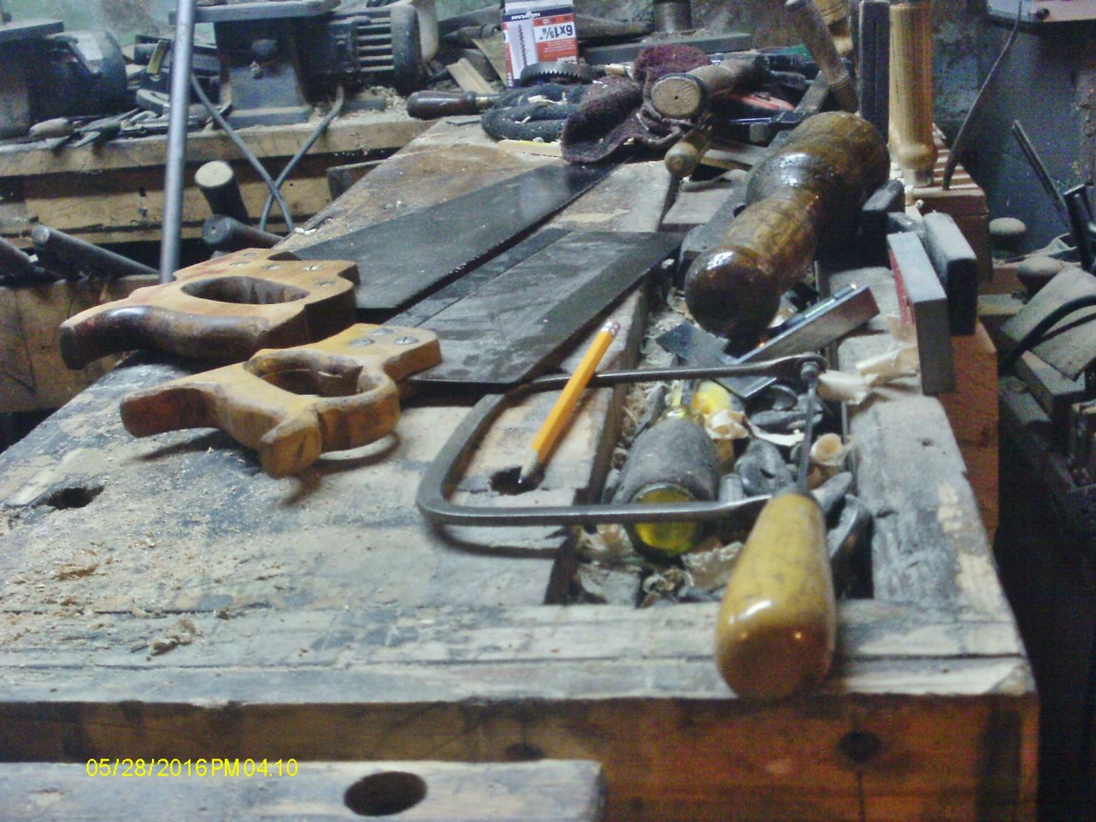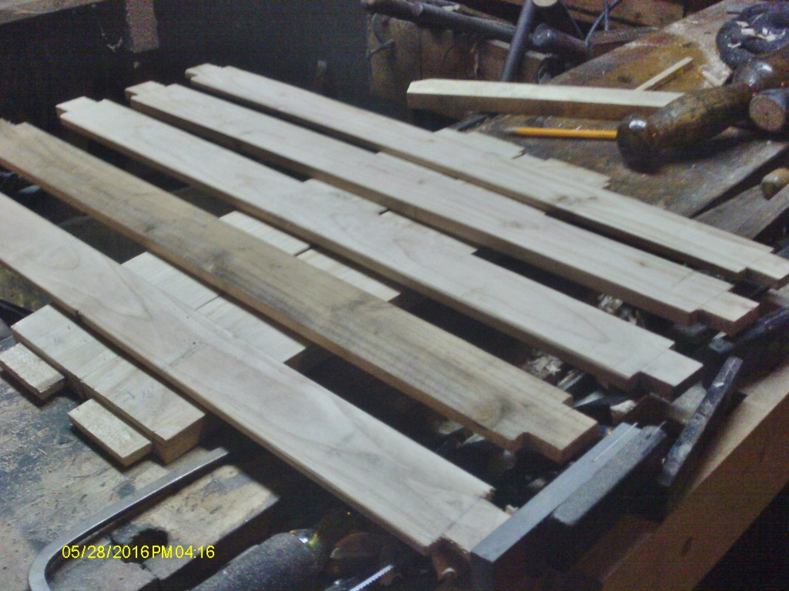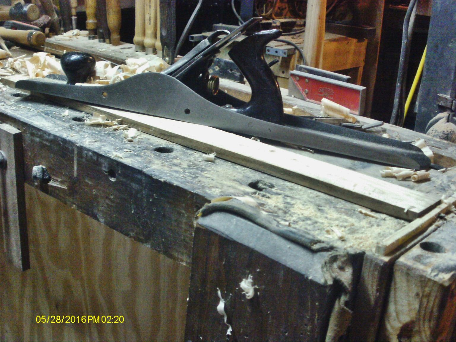 Managed to find a wee bit of time, to go and hide in the shop today. Needed to cut a tenon on the end of the front post, so I could stash the side out of my way And, yes I did use that big,old rip saw. Keystone by Disston. More on that later...stashed the completed side frame over with the other one.. 1" tenon, designed to go throughthe arm rest, and be wedged in place......need to cut armrests...sometime... As for the slats, since the bandsaw likes to make "waves", I needed a plane to remove the waves.. If you look close, there on the end? There is a screw and a scrap of wood. Two screws and another scrap are at the far end. Needed a way to clamp the slat, without running the plane through the clamps. The plane is a Stanley No.7c, jointer plane. Slats are 26" long. I also used this long plane on the edge grain.. When I can get the slat to stand up, that is. Used a block plane to round the corners a bit. Slats were set up to have 1" tenons on the ends. I tend cut 1/4" or so off the sides of the tenons. Slats are a might to thin for any other cuts... Five slats done= 10 tenons made. That coping saw did a bit of the crosscut work. On some of the slats, my backsaw just would not start to cut. Coping saw had no problems. I'm keeping the thicker slats for the middle area of the back. Thinner two are out on the sides, less stress that way. That thing sticking up? Well, as long as I was cutting tenons, might as well do the front seat rail. Again, that 1" length. backsaw was a bit....meh about this job.....sooo Ah, remember about that rip saw? 5-1/2ppi. Challenger by Disston/Keystone Paid $6 for it, and then sharpened it up. Seems to work, a candle rubbed on the teeth helps, too. Made the bigger rip cuts, the backsaw was "shamed" into making the rest.. Disston No.4, 9ppi, filed rip. Got the rail done, but had all these toys in my way.. Needed to clear the "deck". Saws went back up into the overhead till. needed to lay out the spacing (again) of the slats, since some may have gotten skinnier...laid the top and bottom rail on the bench, then spaced the slats out, and made a few marks... Number the slats, too. Then marked the mortise locations, as well. mallet is already out. need to set up a way to chop the mortises. Without things hopping around on the bench. I now have a few 3/16" dowels handy, to pin this thing together, when I can get to the shop, again.. I did find a box fan, and set it up on the dryer. It can now blow cold air on me, as I work. Stay tuned, might get something done, before too much longer?
