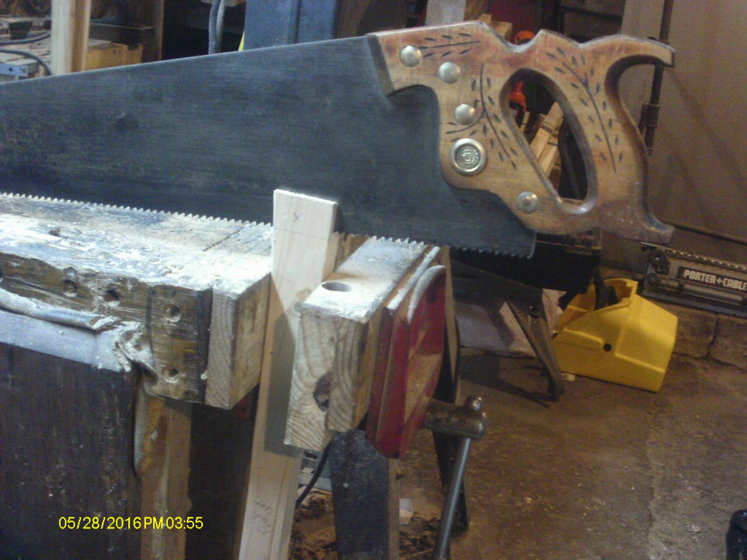 A Disston D-23 needed a refrsh of it's teeth. Has 6ppi. Picked the shop last spring....FREE. Bought a new file to try out. Stanley 6" Extra slim taper file..$5.99+tax. Dug up a few pieces of wood to make the saw vise's jaws had to notch them to fit around the saw's handle. handle won't fit in the vise, plate is tto wide back there. C clamp to hold things still...adapted the file handle to hold the new file ( tang was a bit too long) and started off down the line of all them teeth. 6 x 26"= aLOT of teeth to file. Got a bit closer to the bench vise, things were vibrating a bit...another c clamp was added And we are off! Until I got to the end of those jaws. Mountain Dew Break! Came back, and fought with the jaws to move everything BACK into the bench vise. Had to add a couple pieces out on the end.. Found out I can keep the file's teeth clean by just wiping the file on the leg of my jeans. File was run at a 90 degree to the plate, tipped the file forward just a hair. 4 strokes acoss each tooth. Had to stone the right hand side of the plate, too. Found out there was a bit too much set on that side. ( burrs, maybe?) gave the saw a test drive....first ones not so good. Stoned off the burrs, waxed the plate....still wanted to follow the grain's curves...Ok, got that stuff fixed, and tried a third time.. I marked a line to try to follow. Normally, it would be a knife-wall. Cuts fairly well. Tried in some curly maple.....board's kerf would close up onto the saw plate, causing it to bind. Might use a different saw for maple. Next up....I have a Disston No.7, 7ppi to work over. I think I will go out and get a better set of "jaws" first, better using the file again. Royal PITA to shift everything around. Full length jaws would work a bit better.