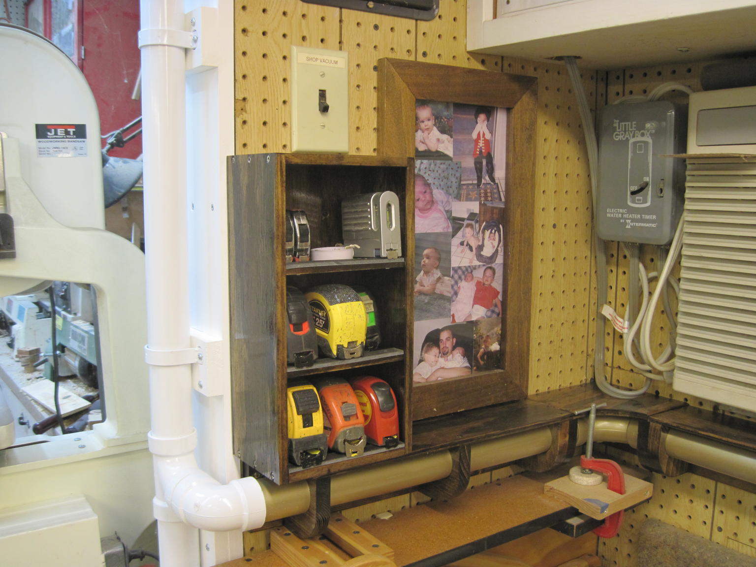 While I use the same tape / rule / square for a given project I still do other work outside the shop requiring different tape measures. Do I really need a 25 ft tape to measure most shop projects inside a 16x20 shop, hmmm no. But work outside doing forms for concrete, building sheds I do need one. Then of course we come to specialty tapes such as a center finder tape or a metric tape. Yes I know about the ongoing debate of Imperial verses metric. Not even going in that direction. Previously I had them laid out in a drawer and that worked well until I got a new 25 ft one and it just was too big to fit. Jammed the drawer more than once and said enough. While I was at it I also could use a place to put my glasses. On top of the oscillating sander was not a good place. Added some pencil storage because I always seem to be needing one and you can never have them close enough to what you are working on at the time. Small project, still takes several days to do finish work and let cure well before installation. It is all about the details. Used some rubber backed flooring turned rubber side up to protect the wood from the viscous tape measure ends. Also keeps them all canted at a slight angle. In theory this keeps them from falling down. Once done a great addition that will prove useful for years to come. We like pictures so I took a few as the installation went along.
