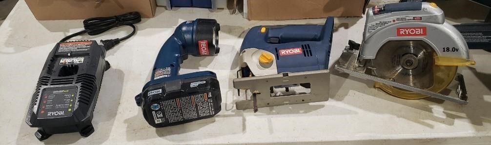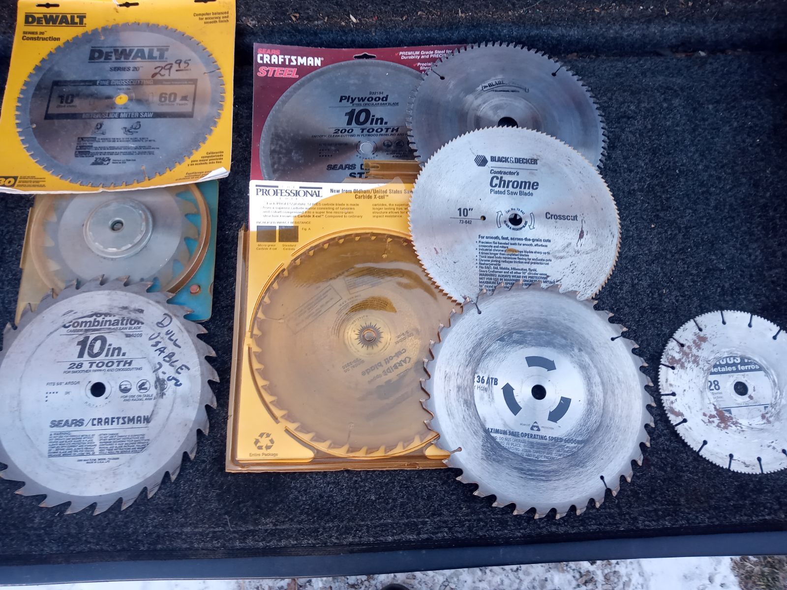 A couple of weeks or so ago I was following an on-line auction that was just a few miles away. A lot of varied type of tools, equipment, contractor supplies, some household etc. Backed off of more lots than I won, but these items followed me home. About $1.15/ea with buyer premium; 2 lots of files; 31 total, several new; some with minimal use; 2 or 3 to be repurposed?? The large rasp to the far left may be a farriers rasp versus wood, but if it'll cut a hoof, should cut wood. There was a third lot much later in the auction. Nothing special in it; files appeared used much more...maybe 12 total?? Sold for more than both of these lots combined This lot was later in the auction. $27.60 w/premium. 13 new, 1 used, reciprocating saw blades, 3 new hacksaw blades, new unused 14pc Bosch Masonry bit set, Irwin, Uni-bit, a WHOLE bunch lot of new, 1/4" lag bolts, Hanson 8" square, Stanley, 8" adjustable square, a Craftsman 3/4" chisel (head mushroomed no extra) but the business end near perfect + miscellaneous. Hanson square already gifted to daughter's fiancee'; probably some of the recip blades will be too. $2.30 w/premium. Figured the 4 gun locks were well worth that not to mention the master locks. All have their keys. Various assortment of putty knives, scrapers. Upper right of cardboard box (3) new, 4x24 80 grit sanding belts. Putty knives, scrapers, & 2 of the yellow gun locks gifted to daughter's fiancee' $26.45 w/premium. (7), 10" blades; 2 NIP, B&D fine tooth, used 1x??? a little rust); 24T, 36T, 48T, carbide; need cleaned for sure; probably need re-sharpened; something to practice with on my sharpener if nothing else??? Not pictured, NIP 7-1/4" B&D plywood blade Middle, left, NIP Delta, 7" adjustable dado (marked $44.95); I have a Craftsman version that came with my table saw package 45 years ago; used it a few times,; kinda scary...at least sounding but it did work. One on lower right is (or was) a 7" ferrous metal blade. pretty dull; may see if I can sharpen it; if not, it'll make nice marking knife blades or ??? $29.90 w/premium so about $6/ea piece. All work; don't think the light was ever used??? (2) saws very little; battery holds charge as it should; There were several Ryobi lots; most all were the newer "lizard green"; all had one battery and charger as this set did. Most of those sold within 25% of new so I backed out of those. Already gifted the light to daughter's finacee'. I have a Ryobi light like this plus Craftsman 19.2v that is identical. Bought a few other lots; various construction nails, roofing nails, finish nails some screws, etc. Less than gas for a trip to town & back would cost if you need any of them. Haven't really looked through much. It was 5* the afternoon I picked stuff up. Finally got it all out of my truck just before the "blizzard" hit. Anyways, thanks for riding along.