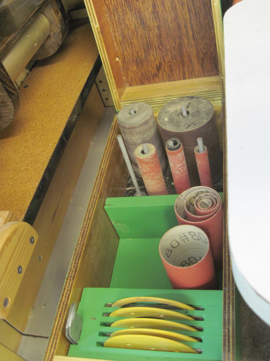 Have had this sander for 15 years. Great sander, works well, never an issue. I like the larger rectangular top verses the other rounder or oval. Only issue I can say I have would be typical of all models I have seen. To consolidate space they put the tools and extra sanding rods around the perimeter of the sander. great idea, BUT I have rarely seen anyone's picture of one where the entire sander can be accessed on all sides. Mine has been against a window for years. Moved it this week and still has same problem. The tools are on the back. So you have to reach blind over the top to get them out. Had enough of this. Made a small box, painted it green for Grizzly and laid out the tools so I have easy access to them when needed, minus the yoga act to do so. No special joints, I used a drawer I displaced on the last project and sized it as needed. The top is a the same thing, another drawer cut down to size and fitted. Hinge was left over from same project so I have no money in this just some time.