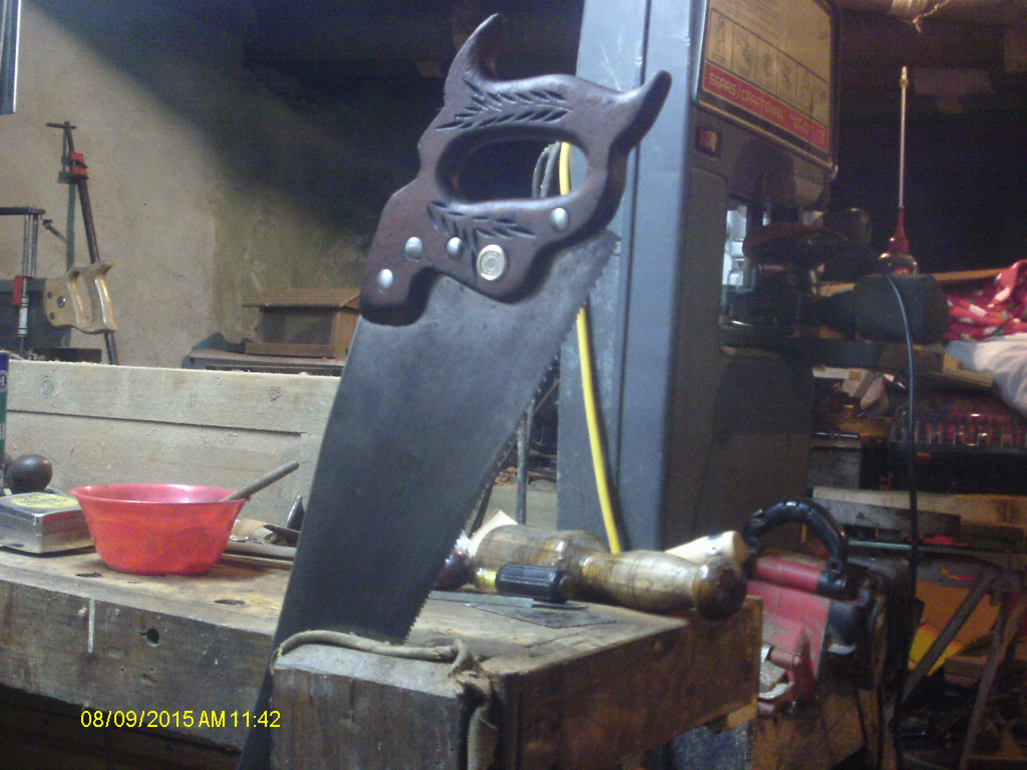 Ok, yard sale finds the other day...spent $5 on three saws like objects, and $2 on a H/P #6500 OfficeJet printer thingy...Son got the Printer up and running. needs to run a phone line to it, and then I can Fax stuff..There is also a copier/scanner in it, that needs to get up and working. Black & white only, until we can get the colour inks.. Now, about them saws. One was bought mainly for the brass hardware...handle was junk, plate was worse..Got the two bolts out, tossed the rest. #2 saw? Was a "Modern" crosscut cut by Great Neck Saw Company. 8 point, straight back. Blockhead of a handle Logo is NOT a painted one. Under a thick clear coat of paint, the logo is an etch! handle just needed some work, though. Took it off the plate, clamped the handle in the vise.. Used a backswa to miter the nose a bit. Then, screwed the handle to the benchtop. Set up a 1/2"round-over bit in the router, and eased the edges on both faces.. Left the handle like this for a bit. Tried a plane first, to remove the old finish. Meh....Sanders did some of the work, A piece of an old saw blade acted as a scraper, too. had to keep refreshing the sharp edge. 1" x 30" beltsander to get into a few cureved spots. It was missing a couple leaves from the carved wheat. Added those with a chisel or two. Third ones up fromthe bottom. Plate was cleaned of the clear coat. bolts shined up.. Look a little better?. There was then saw #3...A Craftsman Special Saw. says so right in the readable etch, no less. The handle needed refinished, bolts shined up, the plate ghad a thin layer of rust. Looks a wee bit better now. There was a small kink in the blade, got that hammered out. I tried to "clock" the slots on the bolts... I need to find a way to better bring out the etch on these old saws.... Both handles now have three coats of that SMELLY BLO on them. Afternoon of fun...